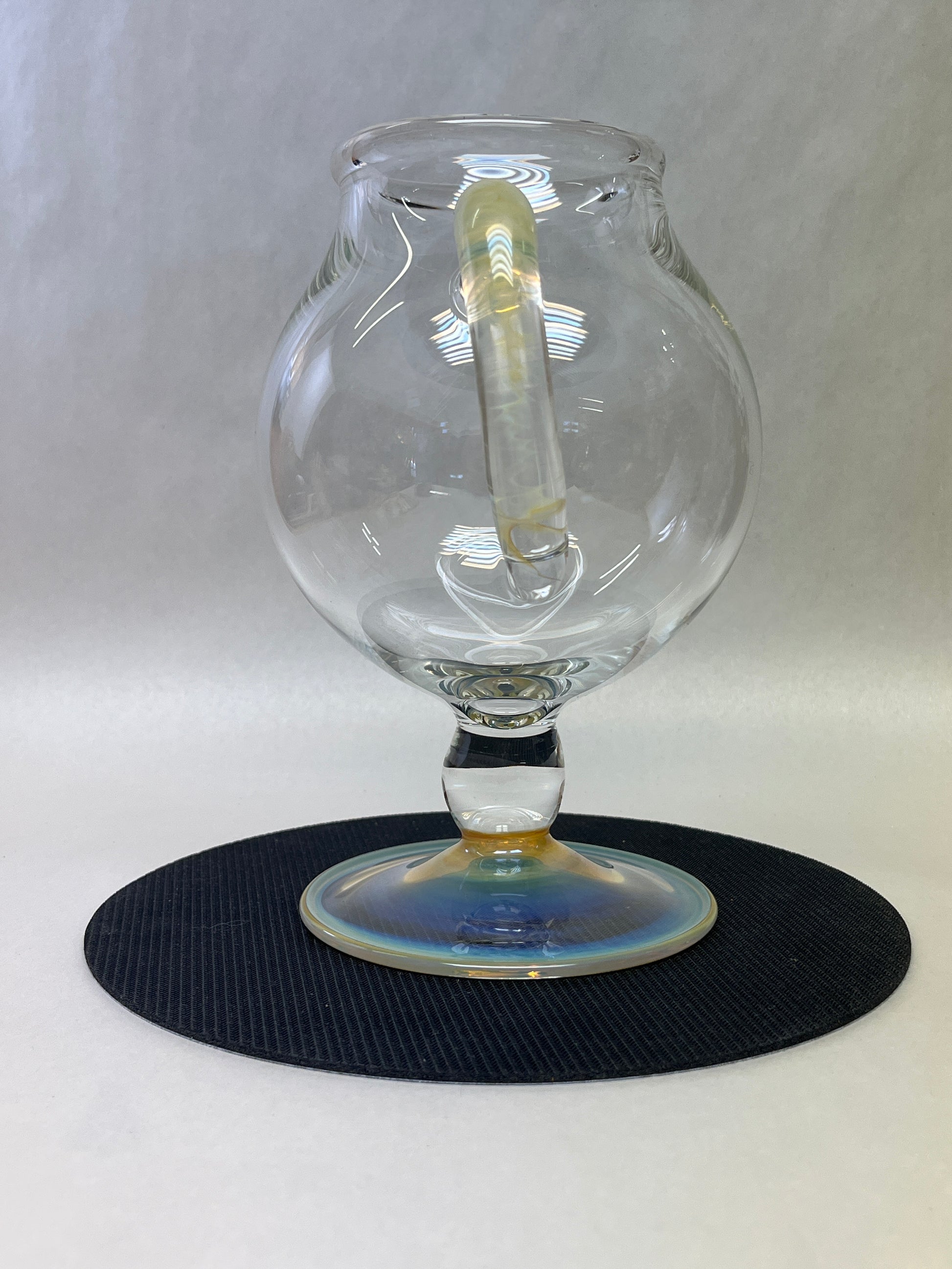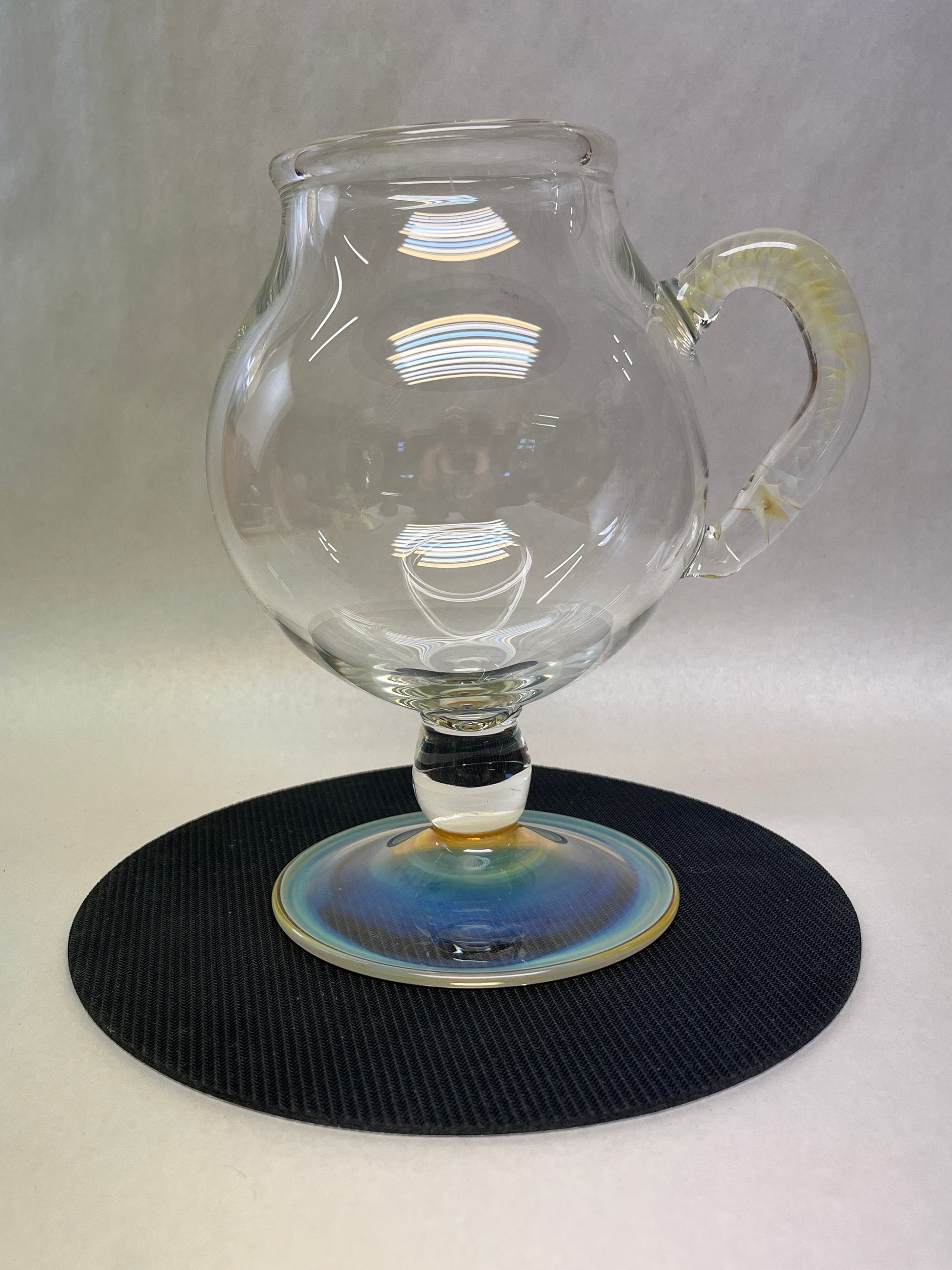 Start your day with heat, glass, and grit. This hand-blown coffee cup by Throckmorton fuses functional design with molten elegance. The rounded bowl concentrates warmth and aroma, while the sculpted handle offers a comfortable, balanced grip. Its iridescent base catches the light with every sip—a subtle nod to the alchemy behind the glass. Crafted for those who take their coffee strong and their style stronger.