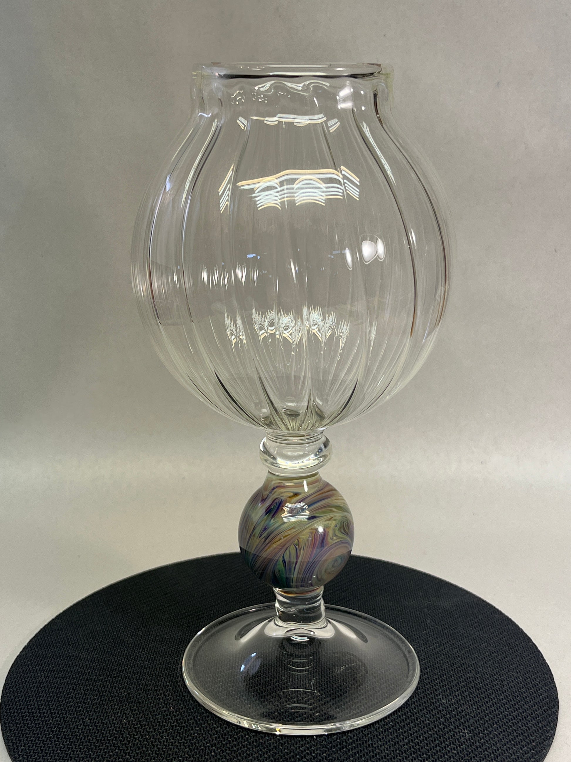 Elevate your drinking experience with this stunning, hand-crafted goblet by Jeremiah Throckmorton. Sculpted from premium borosilicate glass, the bowl features delicate vertical ribs that catch the light beautifully, while the stem showcases a mesmerizing swirl of cosmic colors — a true signature of Throckmorton’s artistry.