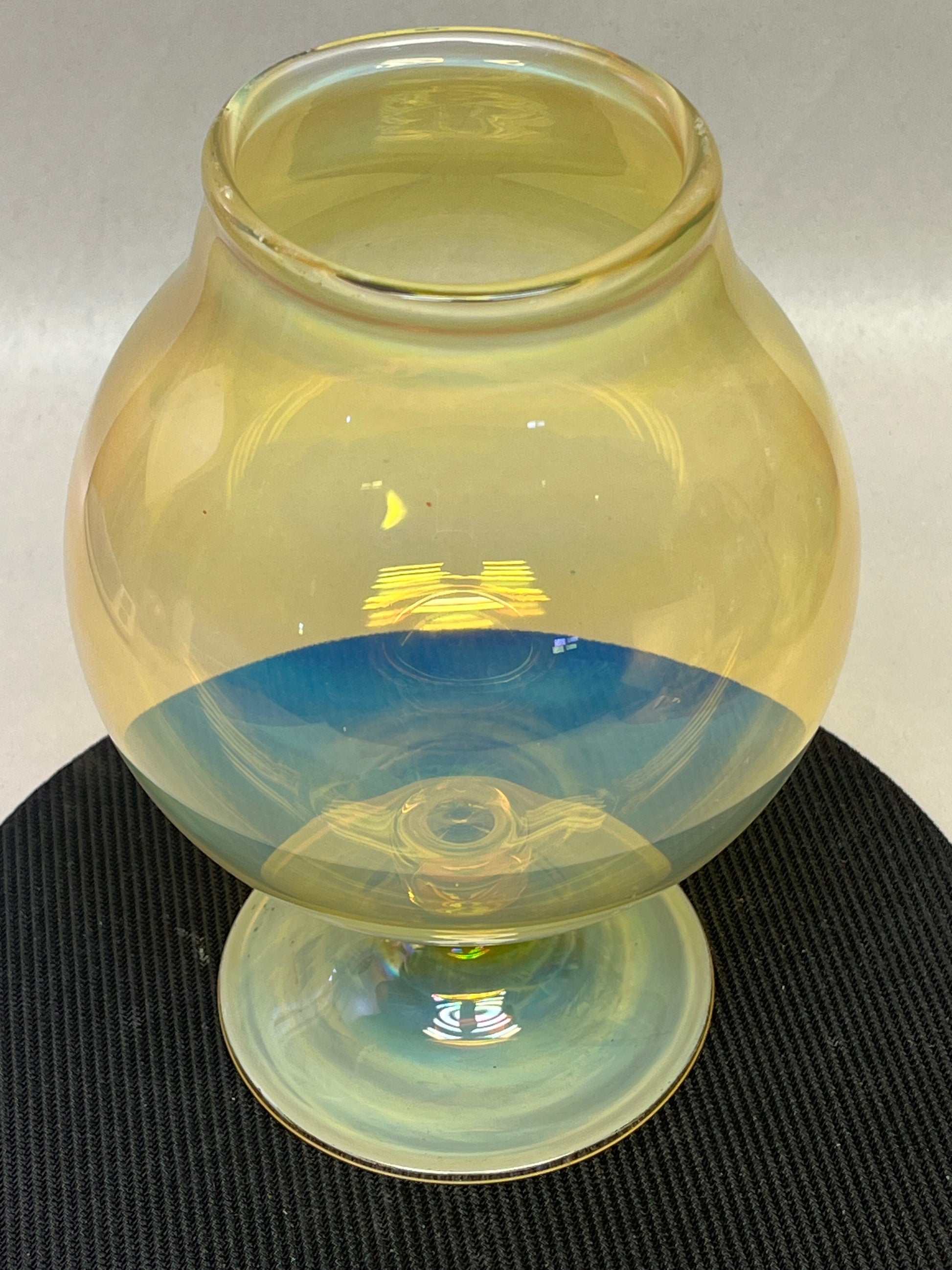 Handblown with precision and soul, the Golden Hour Goblet captures the warm glow of sunset in molten glass. Its generously rounded bowl is formed from translucent golden hues with a soft opaline luster, designed to elevate your sipping ritual — whether it’s fine spirits, crafted cocktails, or simply water in style. Balanced atop a crystal-clear orb and a subtle iridescent base, this goblet is both sculpture and function — a true expression of Throckmorton craftsmanship.