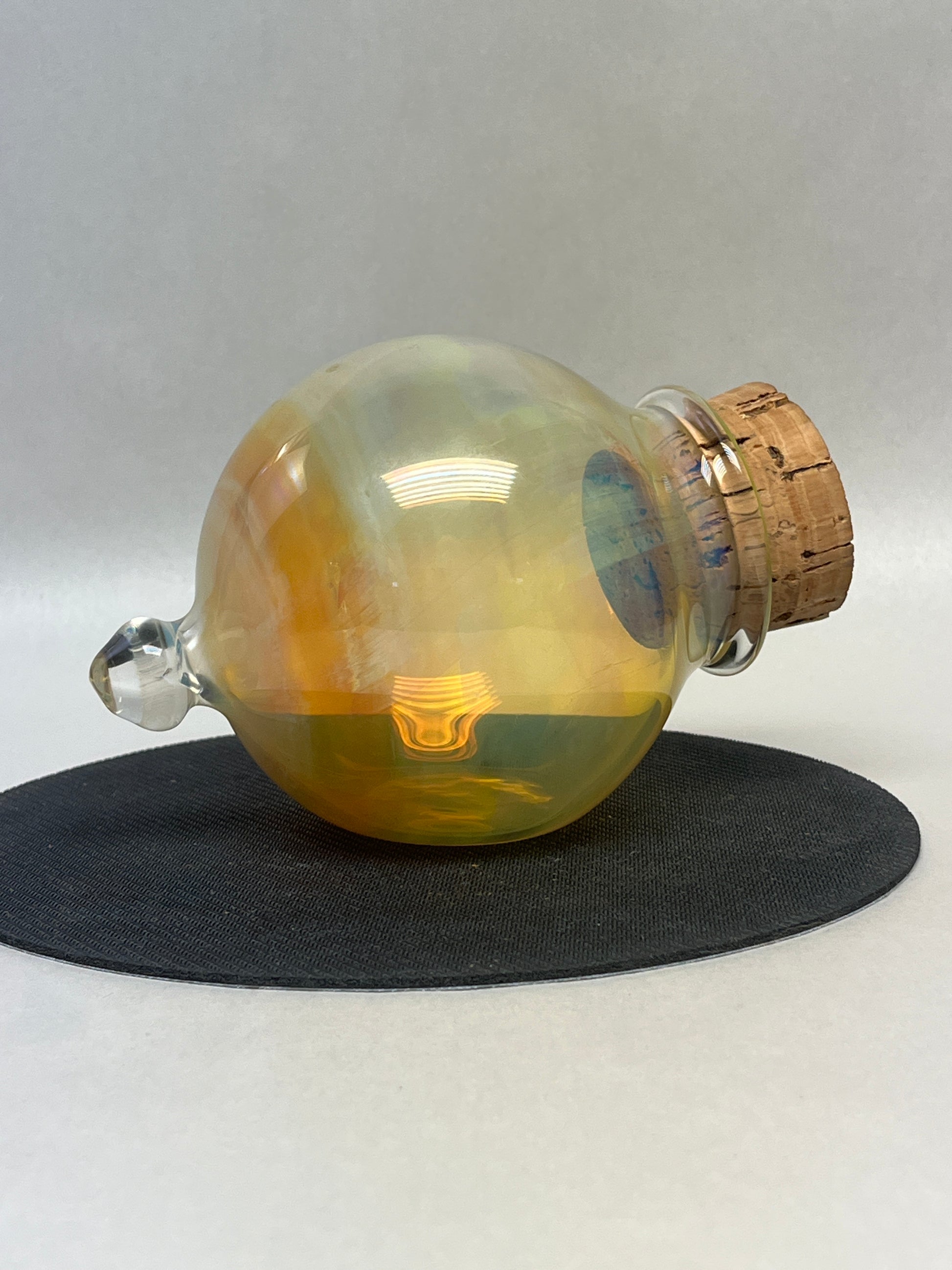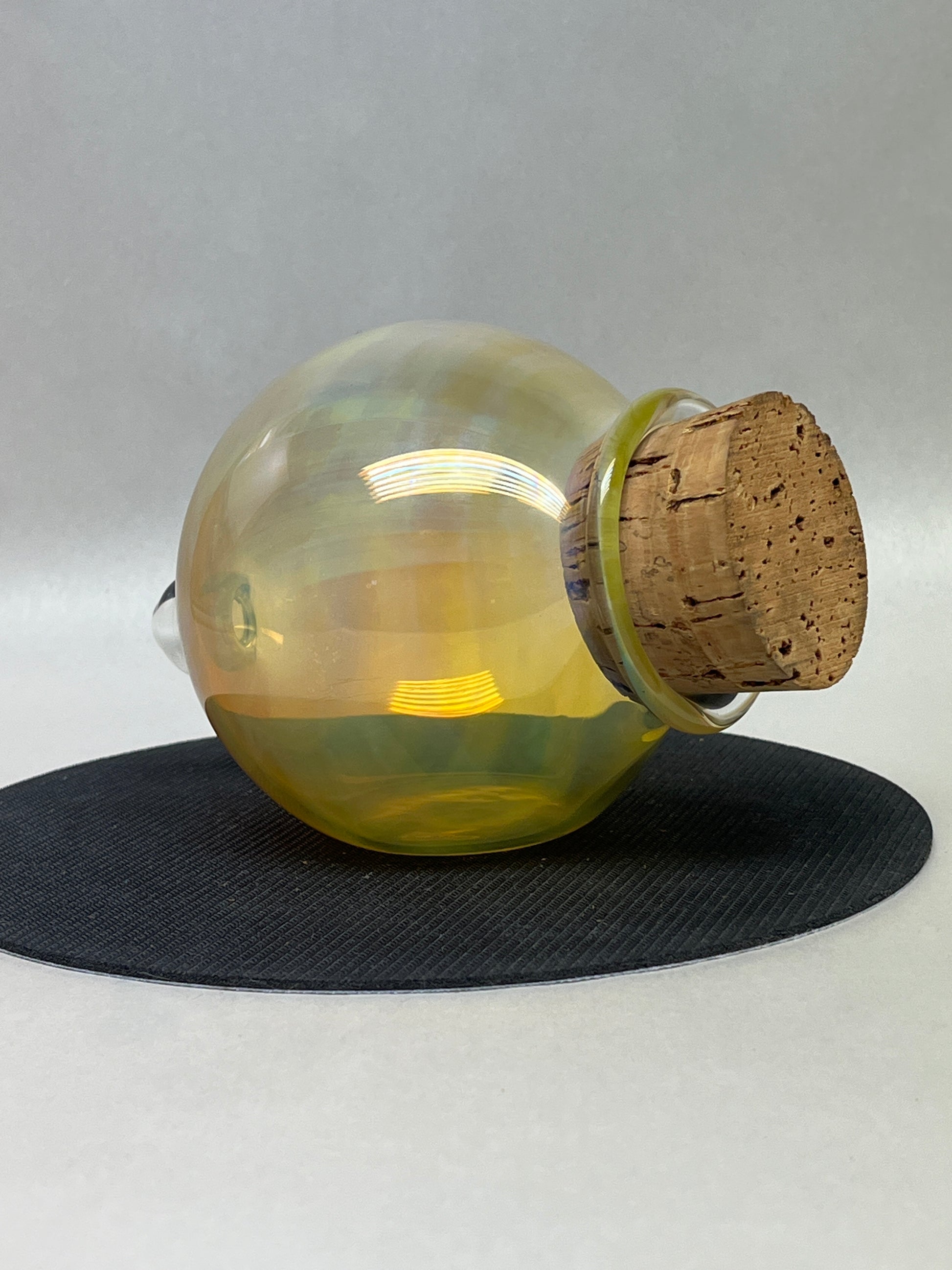 “A handcrafted glass jar, beautifully fumed with pure silver to create a shimmering, iridescent finish that shifts in the light. The wide-mouth design offers easy access, while the durable construction makes it ideal for storing herbs, tobacco, or other treasured materials. Each jar carries its own unique luster—subtle blues, purples, and golds that dance across the surface—showcasing the alchemy of flame and precious metal. A functional piece with a touch of magic.”