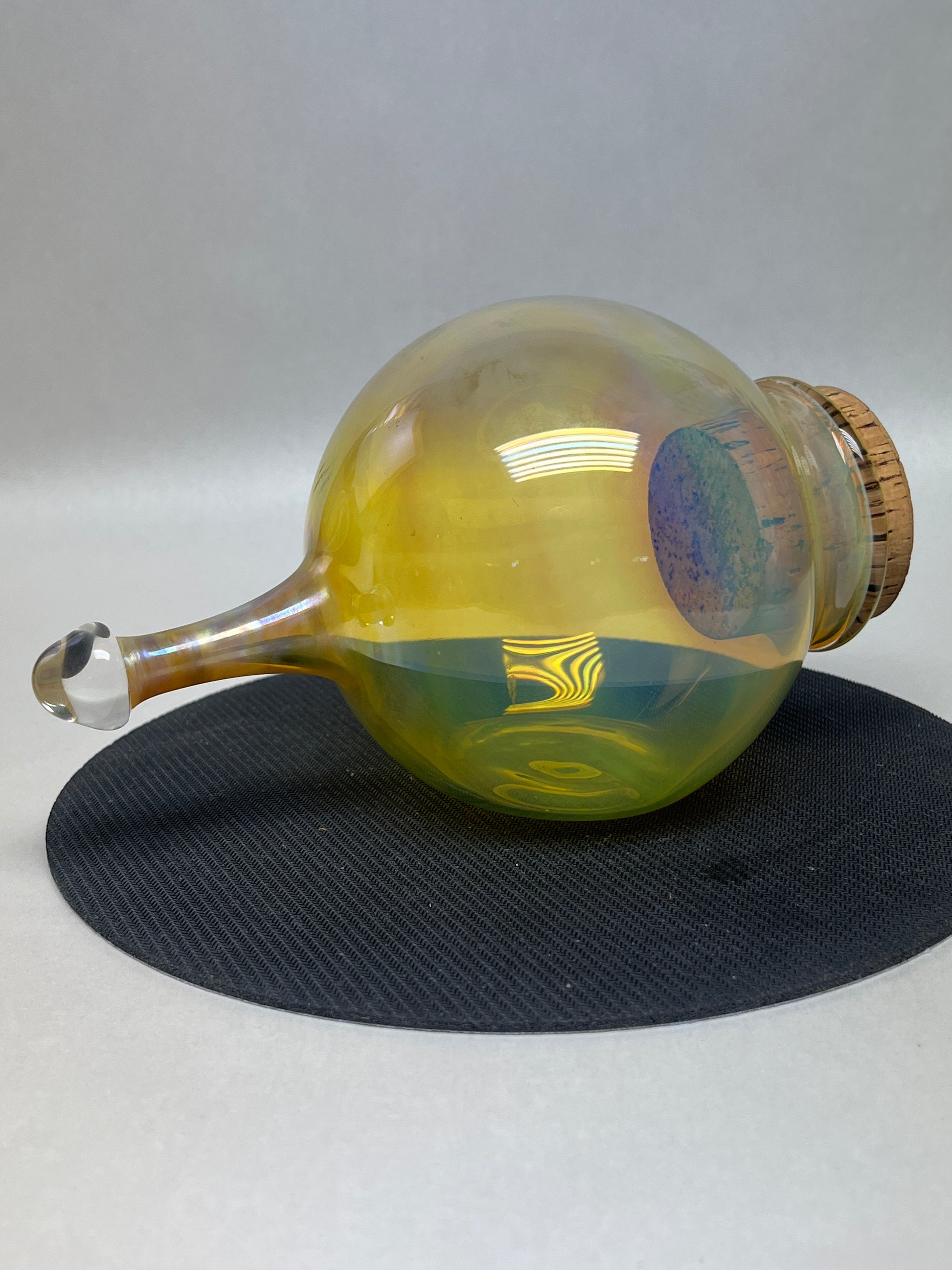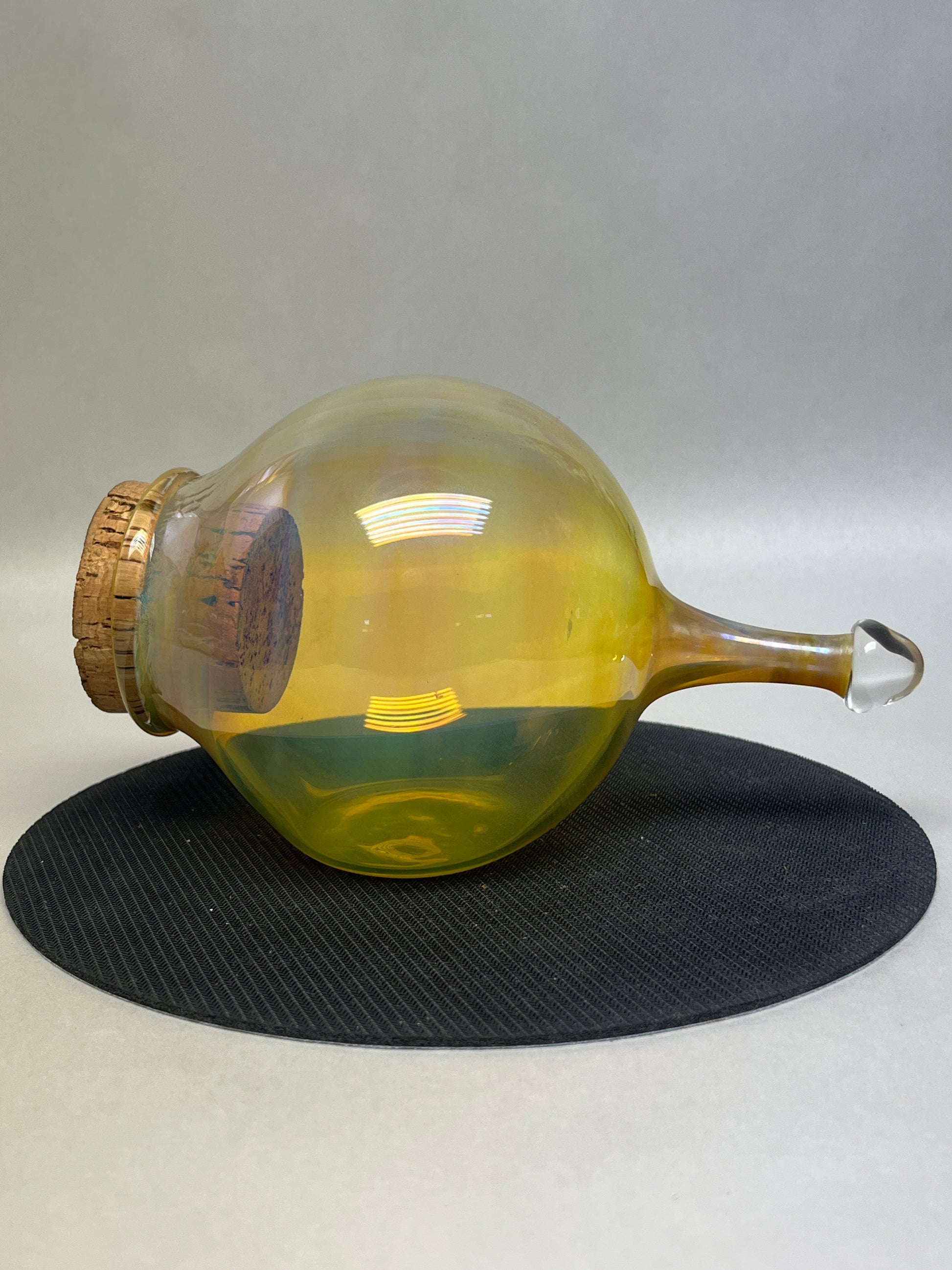 Handblown and fire-forged in Alaska, this distinctive glass jar features a rich, iridescent finish created by fuming with pure silver. The result is a luminous surface that shifts between golden tones, soft blues, and subtle purples—an ever-changing reflection of light and flame.