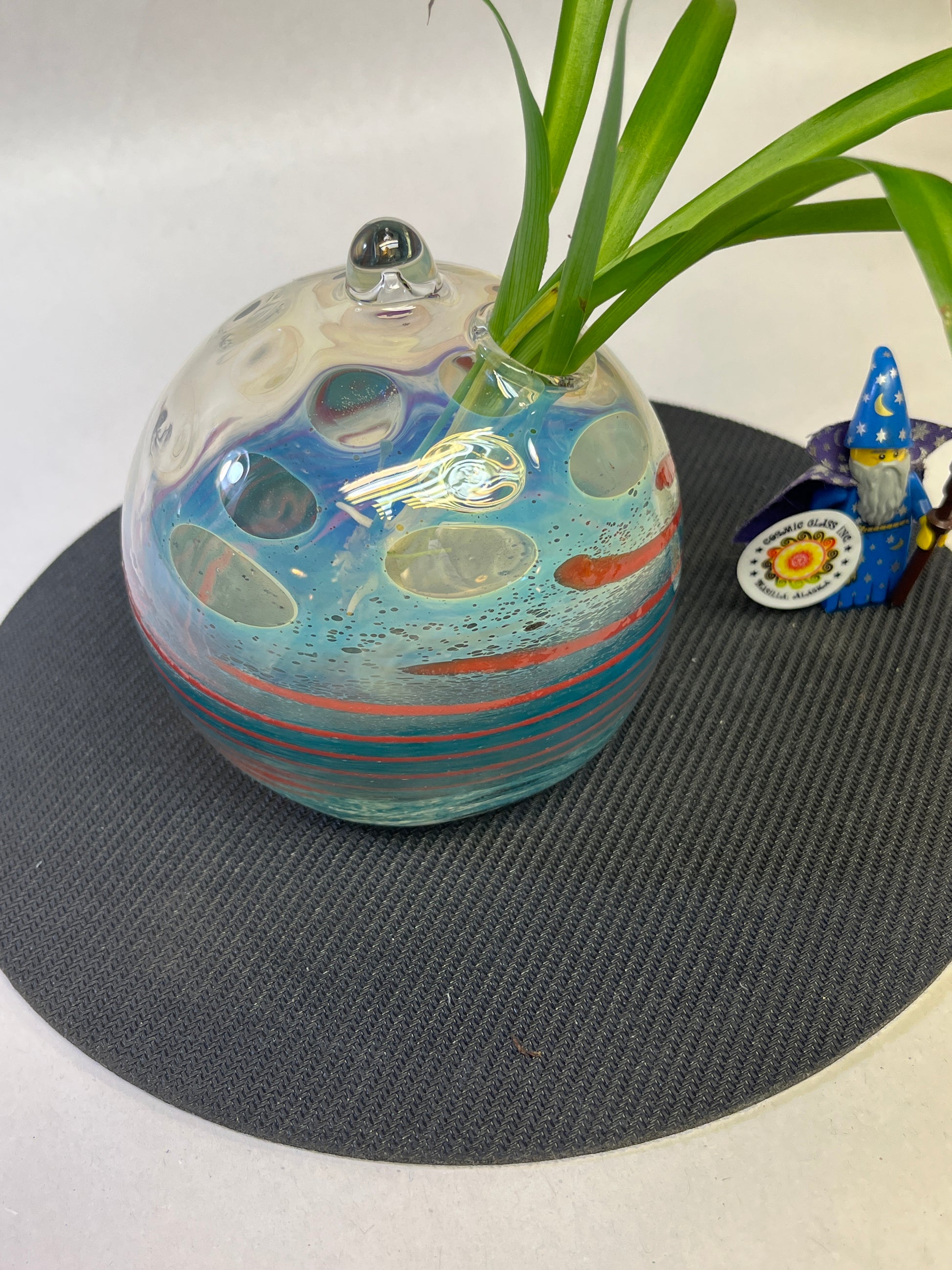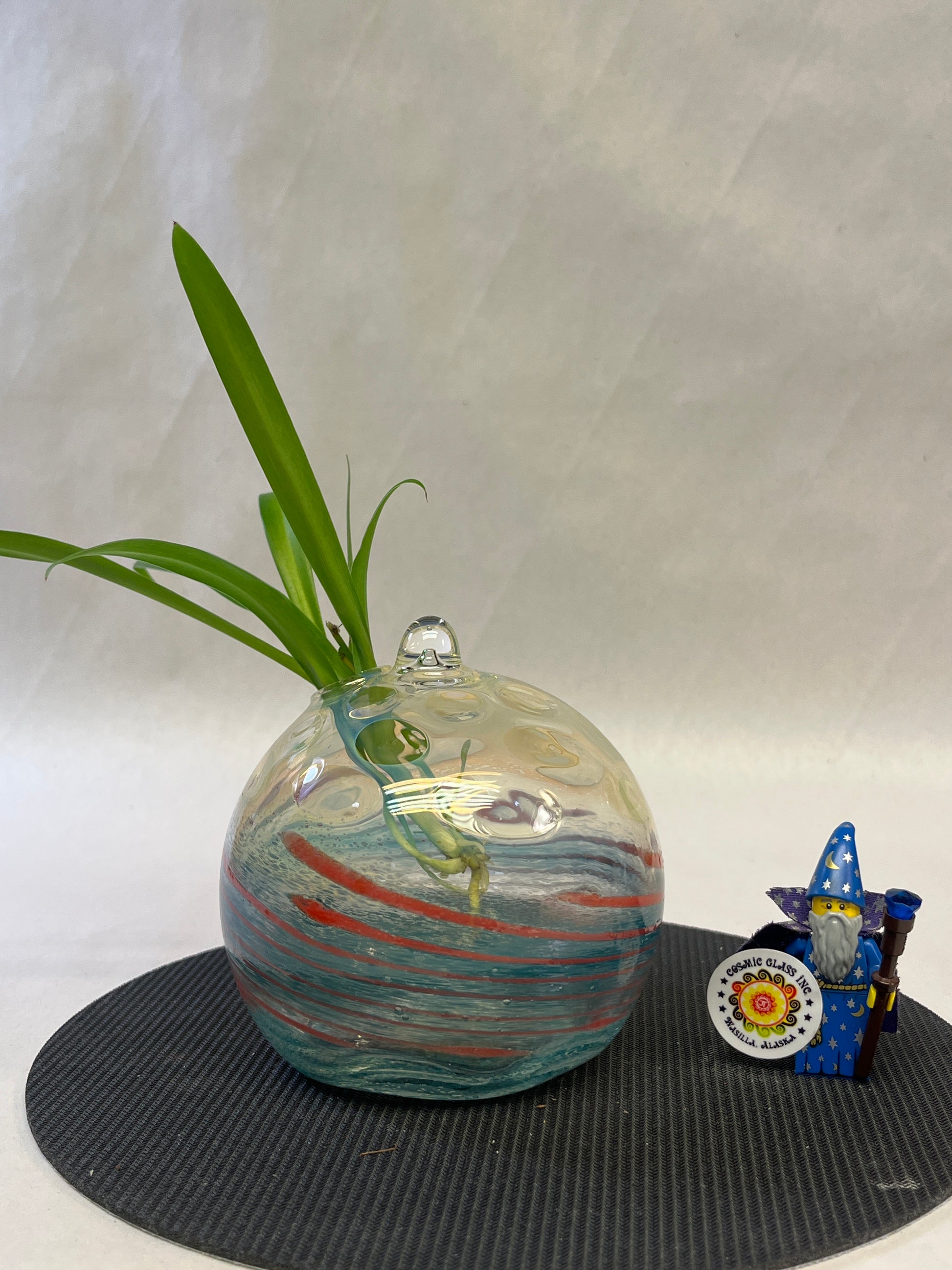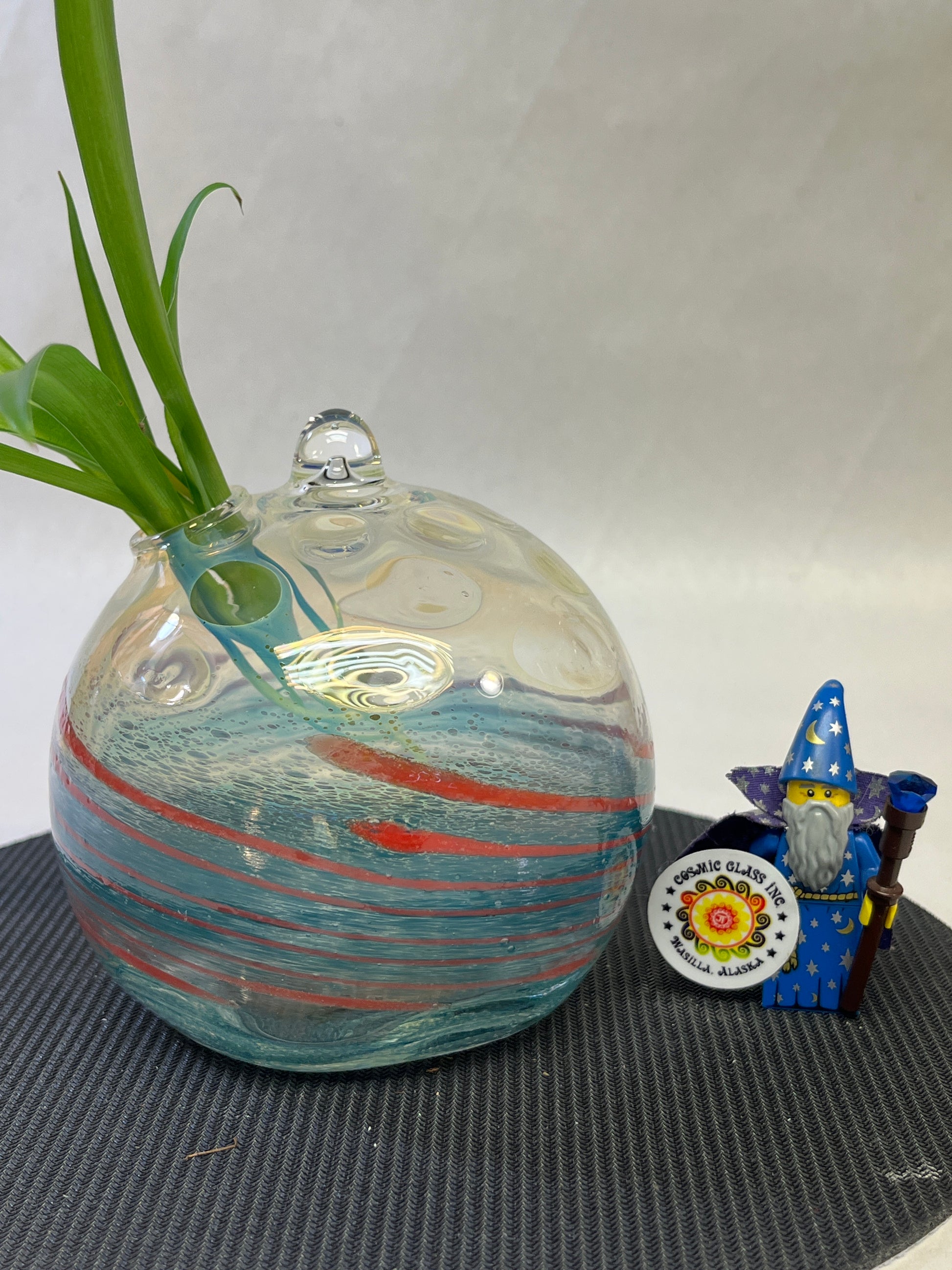 This unique Rooter Ball brings together the art of glassblowing and the beauty of plant propagation. Featuring swirling hues of ocean blue and coral red, the “Whirlpool Sunset” design captures the calm energy of coastal tides. Its rounded form and angled opening make it perfect for rooting plant cuttings or displaying a minimalist stem.