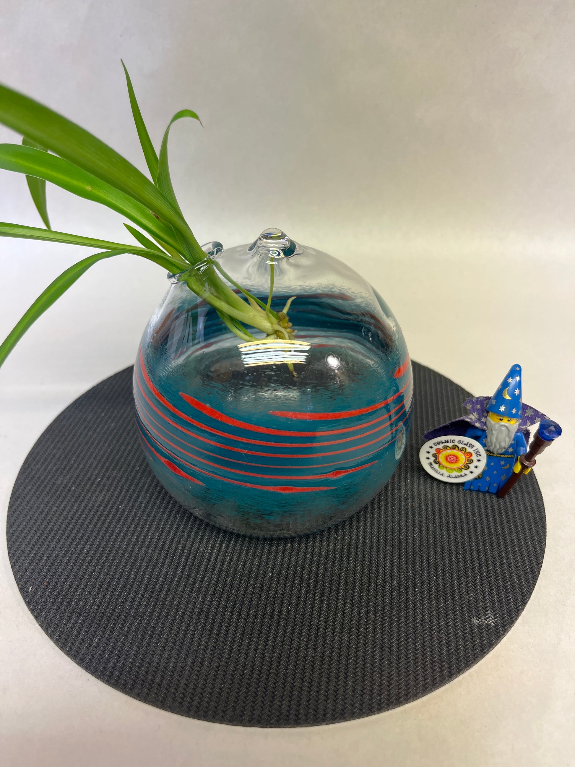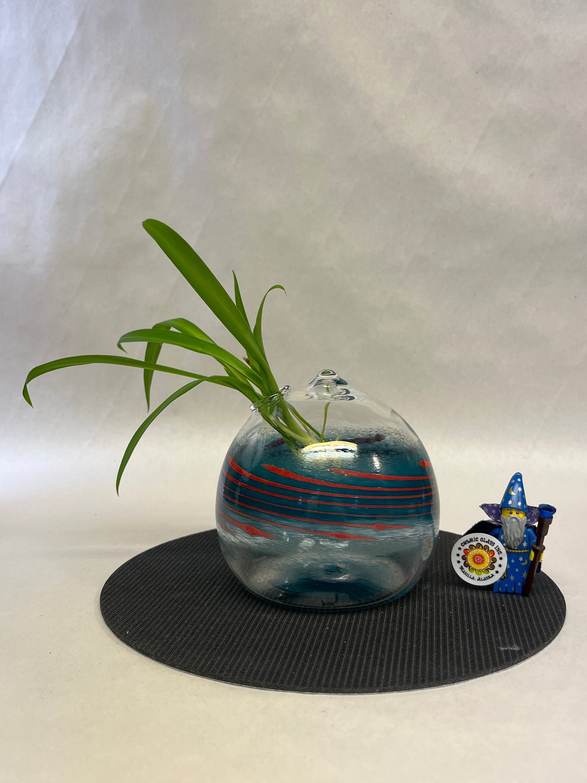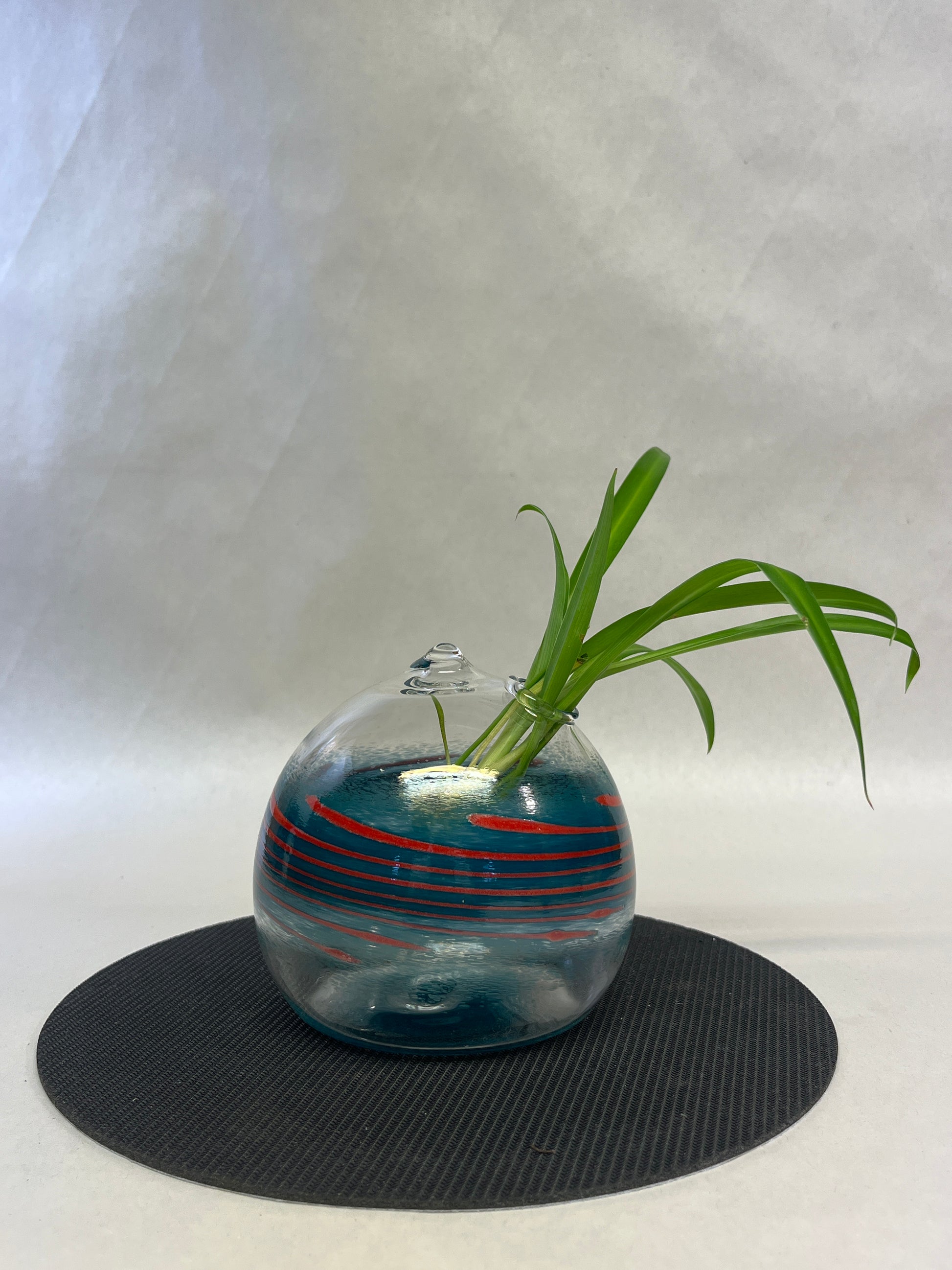 Bright red bands spiral around a sea-glass base in this bold and modern Red Current Rooter Ball. Hand-blown with care and precision, it’s designed for propagating your favorite plant cuttings or displaying a clean, simple stem. The rounded form and angled opening offer both function and visual balance—making it a standout on any shelf or windowsill.