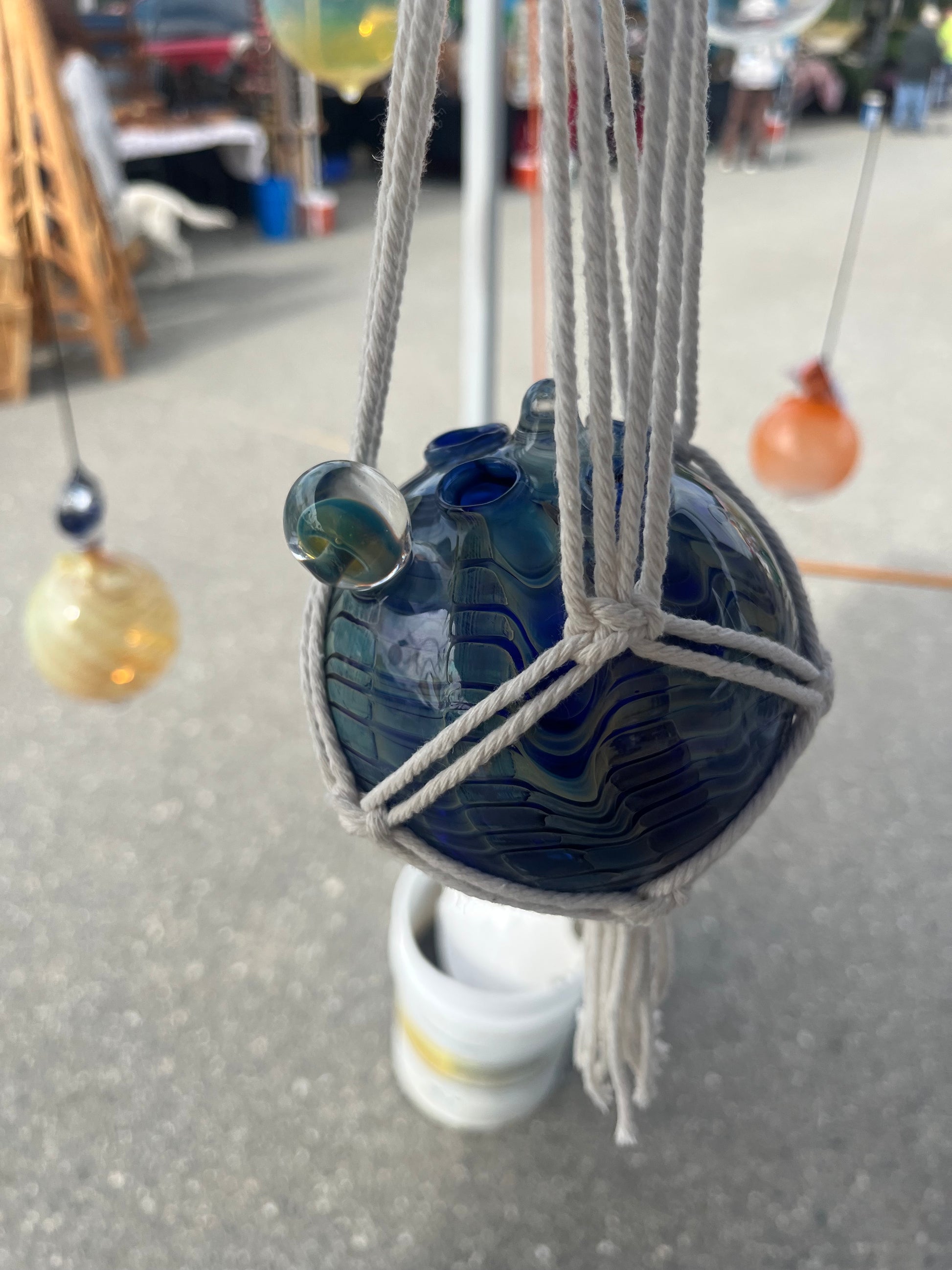 Bring a touch of timeless craftsmanship to your space with this handblown glass float, cradled in a hand-tied macramé hanger. The glass sphere shimmers with rich blue tones and intricate patterns, reflecting light beautifully whether displayed indoors or outdoors. Traditionally inspired by Japanese fishing floats, these pieces carry a sense of history and artistry while serving as striking décor. Perfect for hanging in windows, patios, or as a centerpiece in your home. Each float is individually blown, ensuring no two are exactly alike.