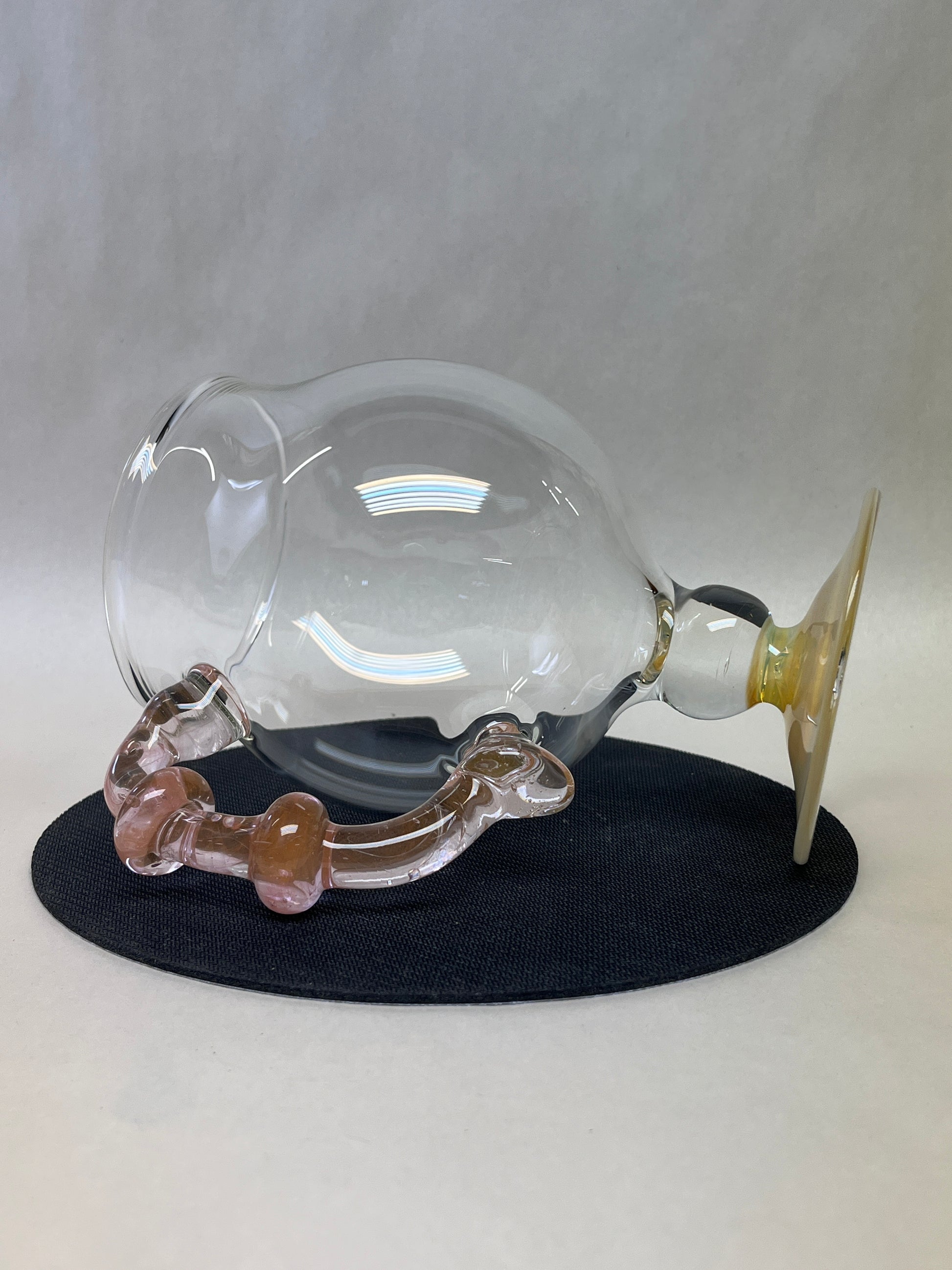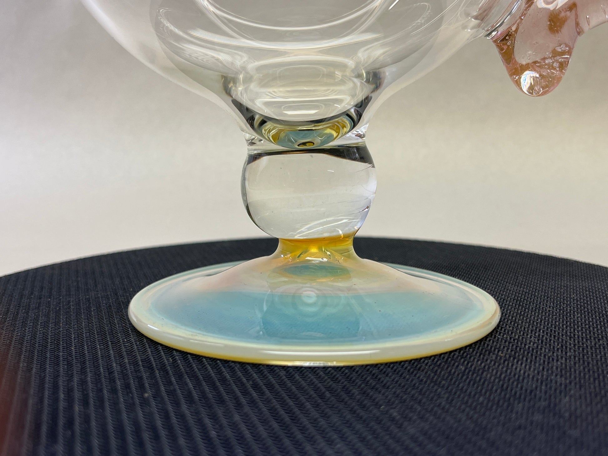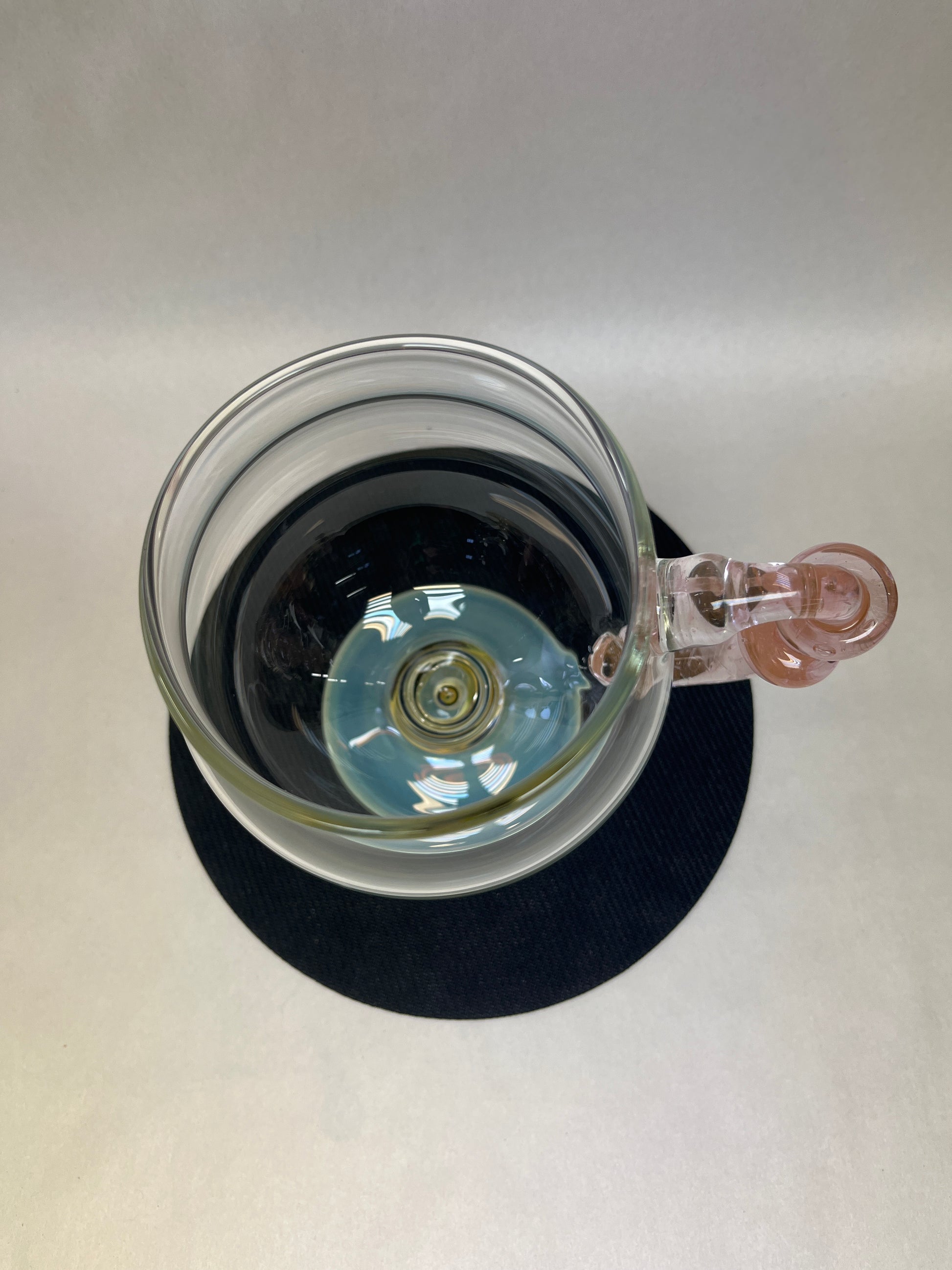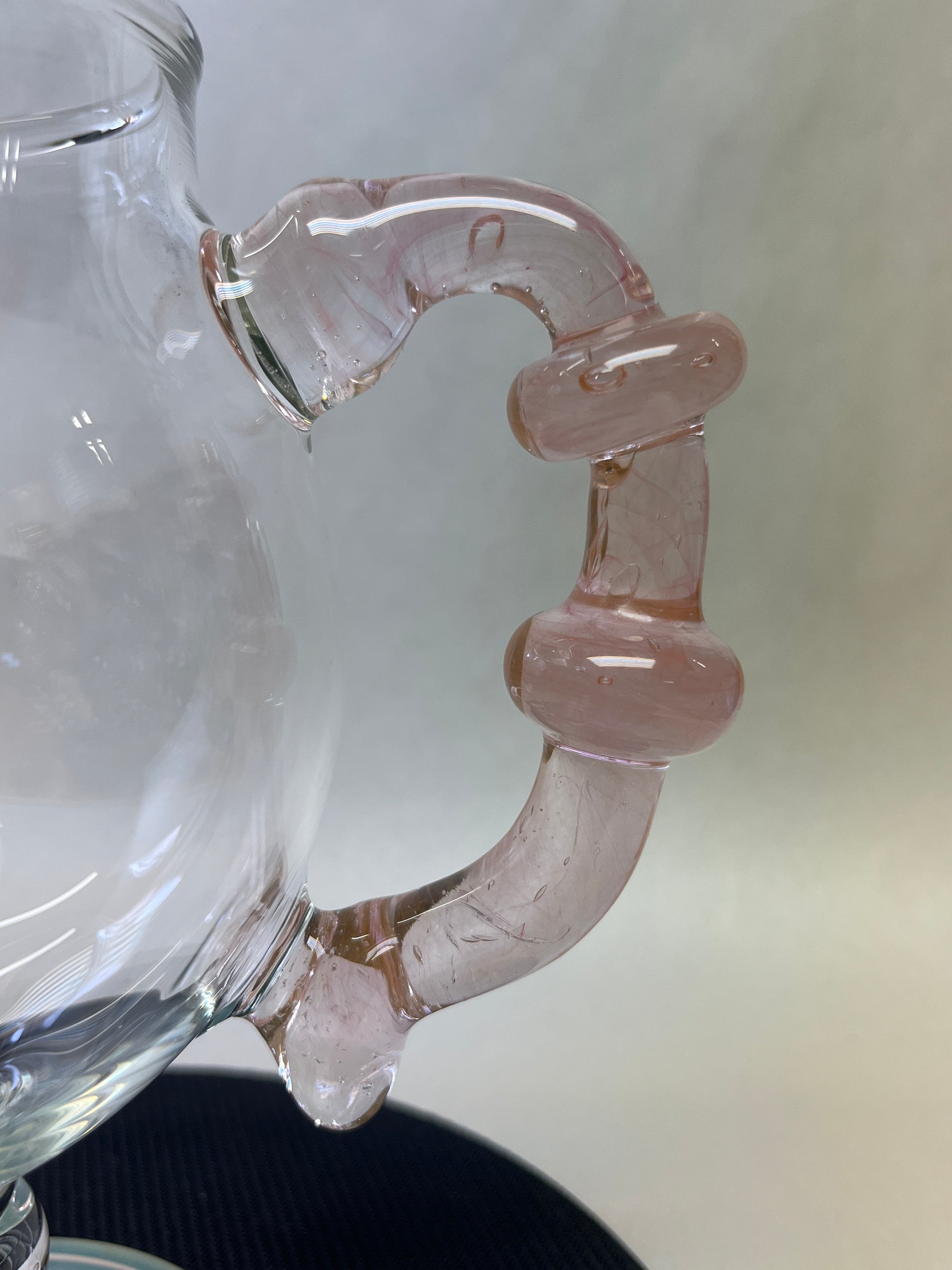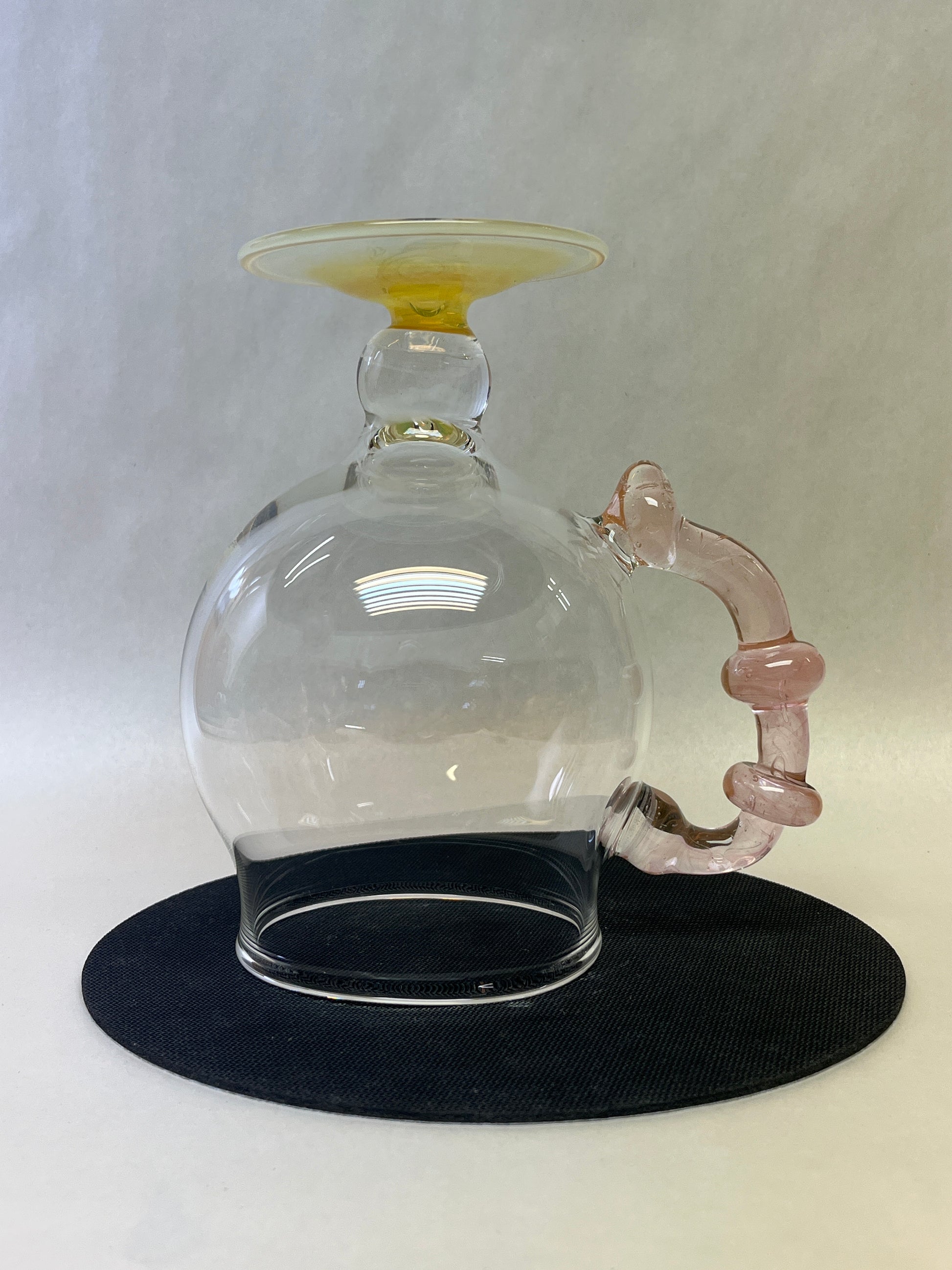 Sculpted from flame and air, this hand-blown glass goblet turns your daily brew into a ritual. The curvaceous bowl enhances aroma, while the uniquely twisted blush handle offers both comfort and style. Anchored by a shimmering pastel base, every angle of this piece reflects the artistry of its maker. Ideal for those who believe their coffee deserves more than a paper cup.