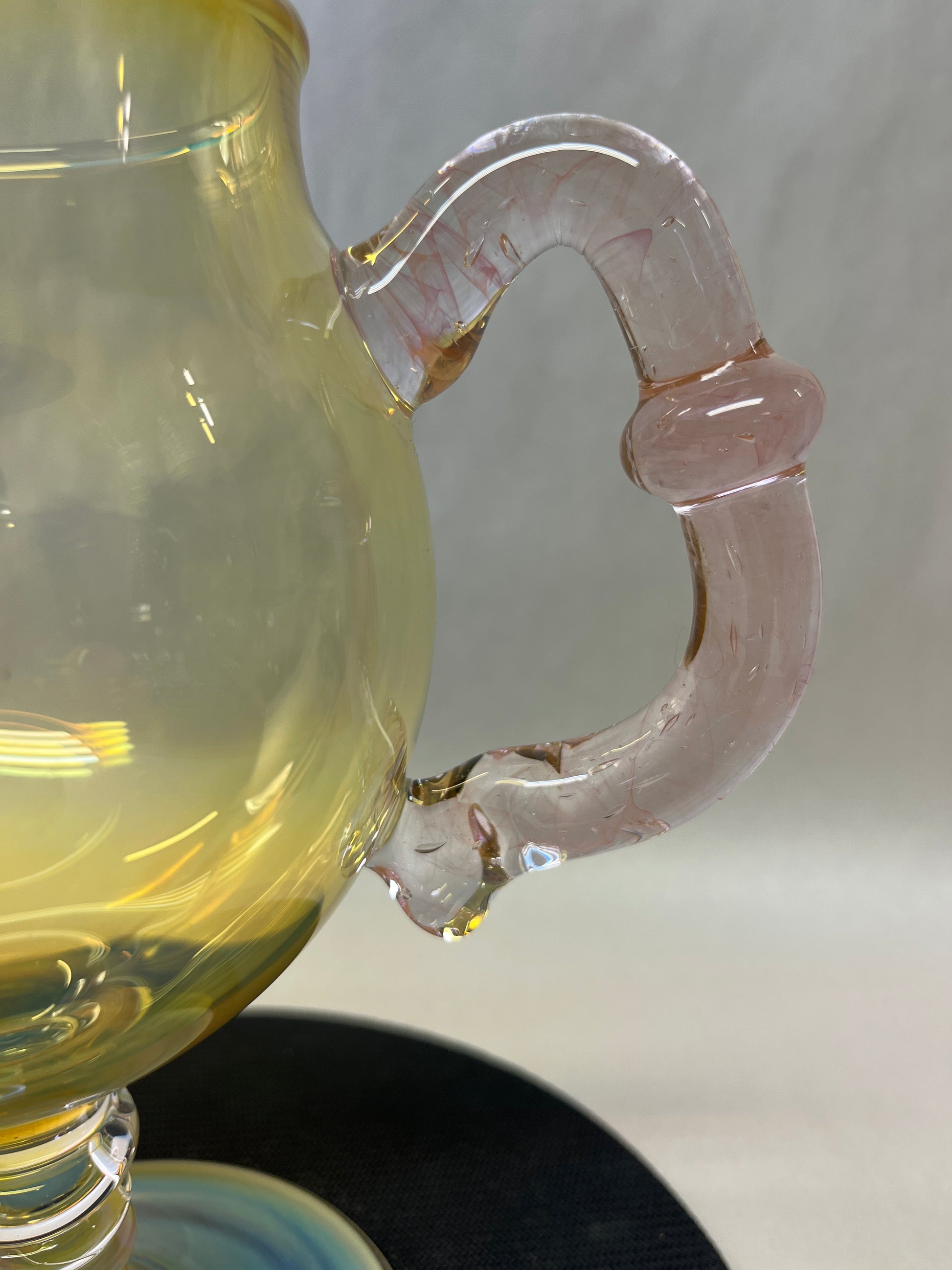 Crafted by fire, shaped with intention—this hand-blown coffee cup is a statement of both art and utility. Featuring a radiant amber body with soft golden hues that catch the morning light, it’s balanced atop a swirling oceanic blue base and finished with a sculptural clear-pink handle that rests easy in the hand.