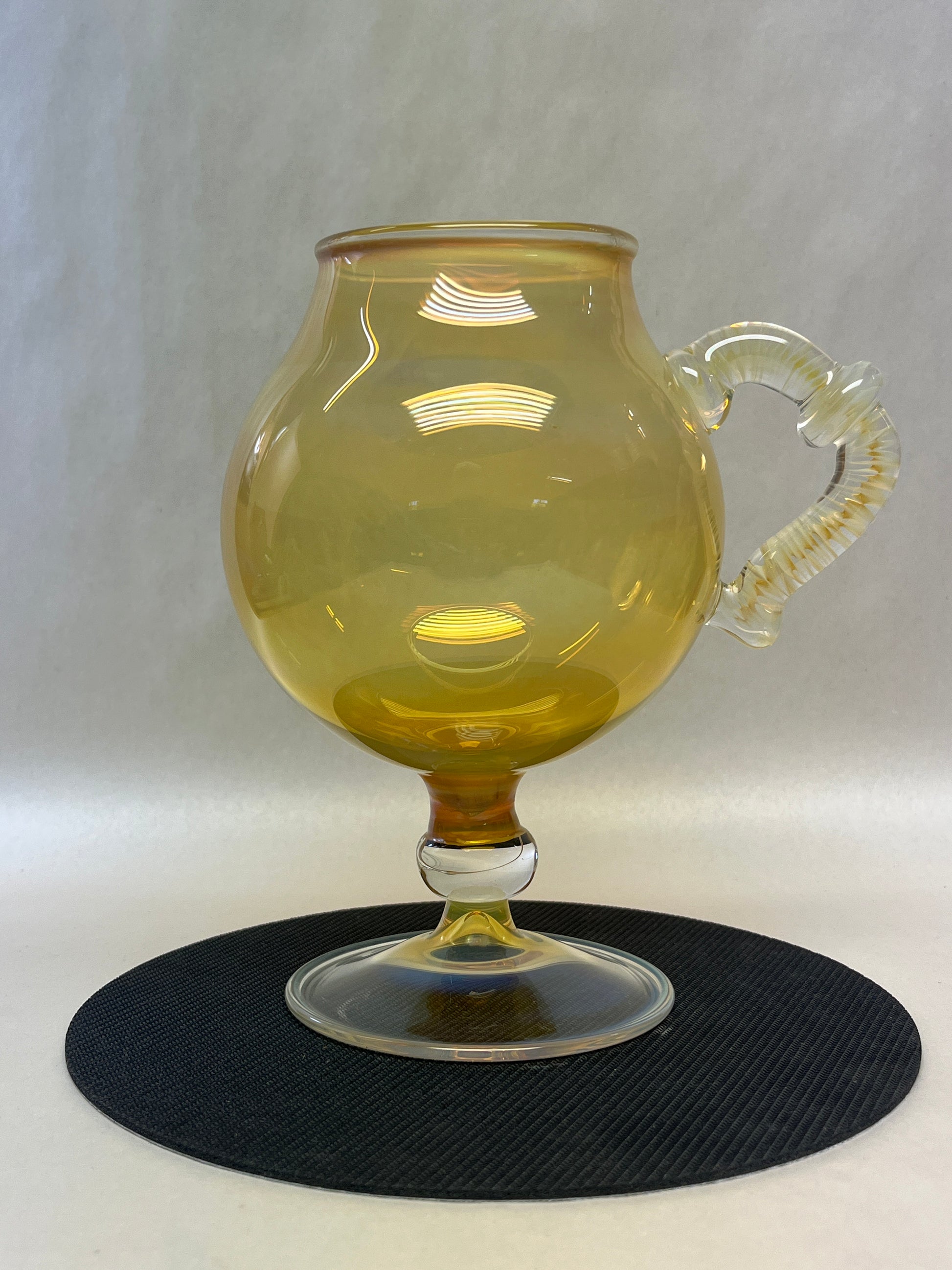 A vessel of refined craftsmanship, this hand-blown glass coffee cup radiates with a soft golden glow—capturing the light like morning sun through honey. Featuring a generous bowl, a sculptural ribbed handle, and a solid pedestal base, it merges vintage charm with bold contemporary elegance.