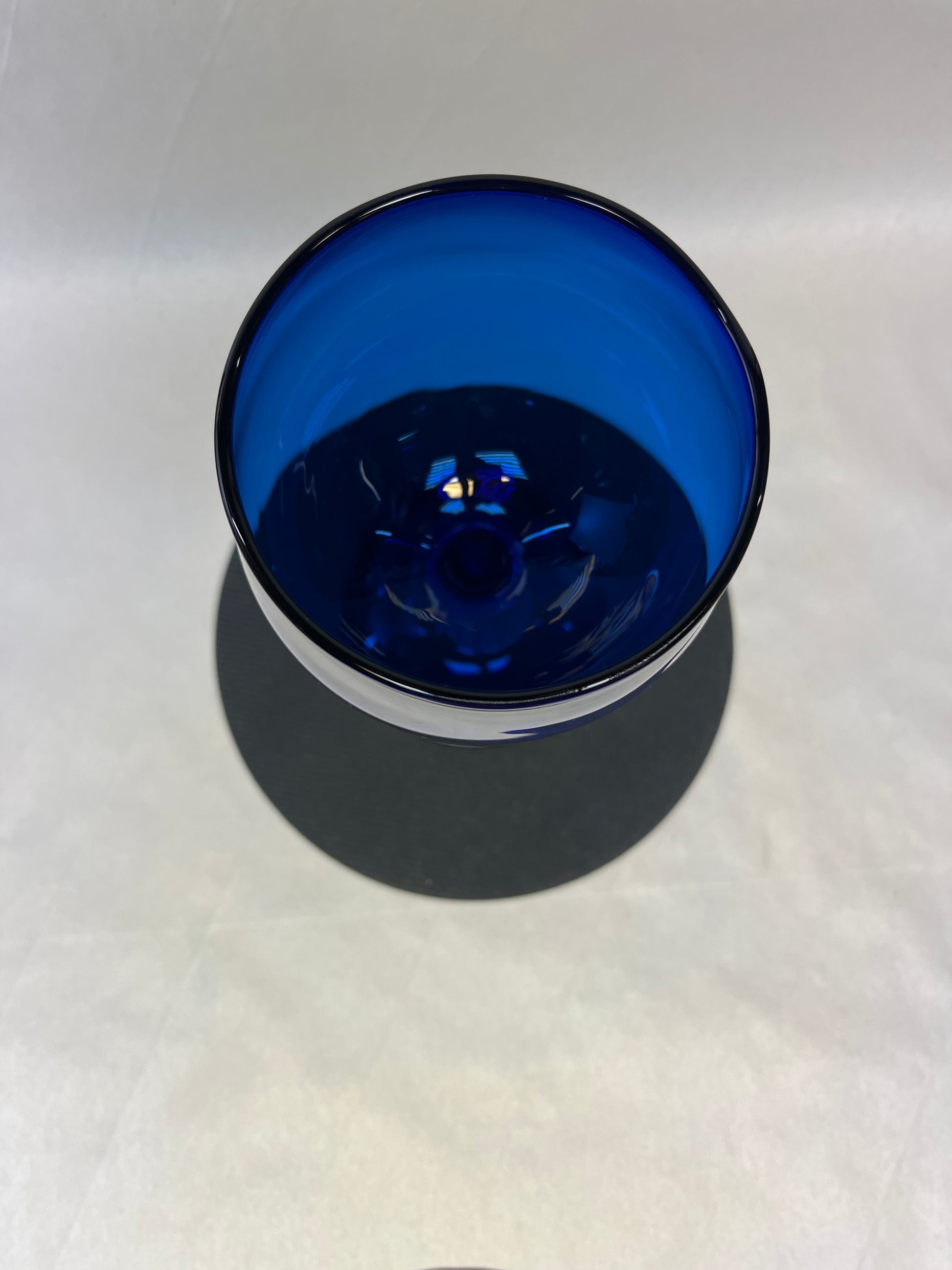 “This handcrafted goblet features a rich cobalt blue top and base, elegantly balanced by a sculptural twisted stem in matching blue. The stem’s spiral form catches light with every turn, adding a sense of motion and depth to the piece. A bold yet classic design—perfect for those who appreciate the fusion of form and function.”