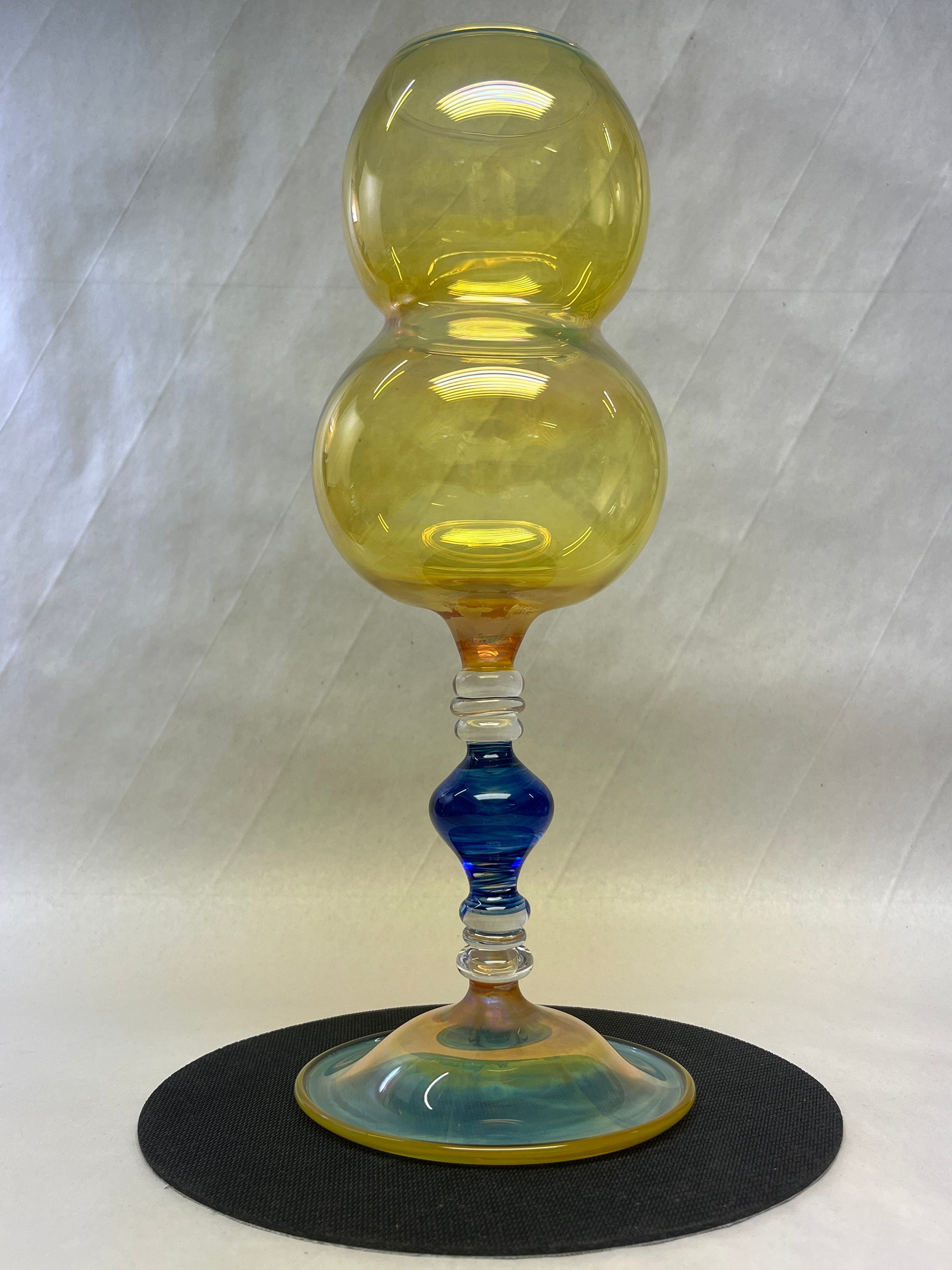 This one-of-a-kind Throckmorton Goblet radiates elegance and bold design with a vibrant yellow double-chambered bowl and a sculpted stem of cobalt blue and crystal-clear accents. The wide, iridescent base anchors this piece with balance and grace, catching light from every angle.