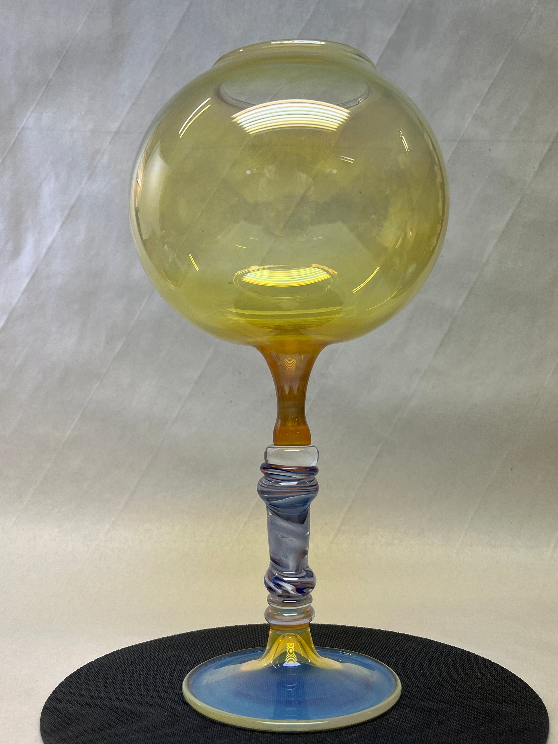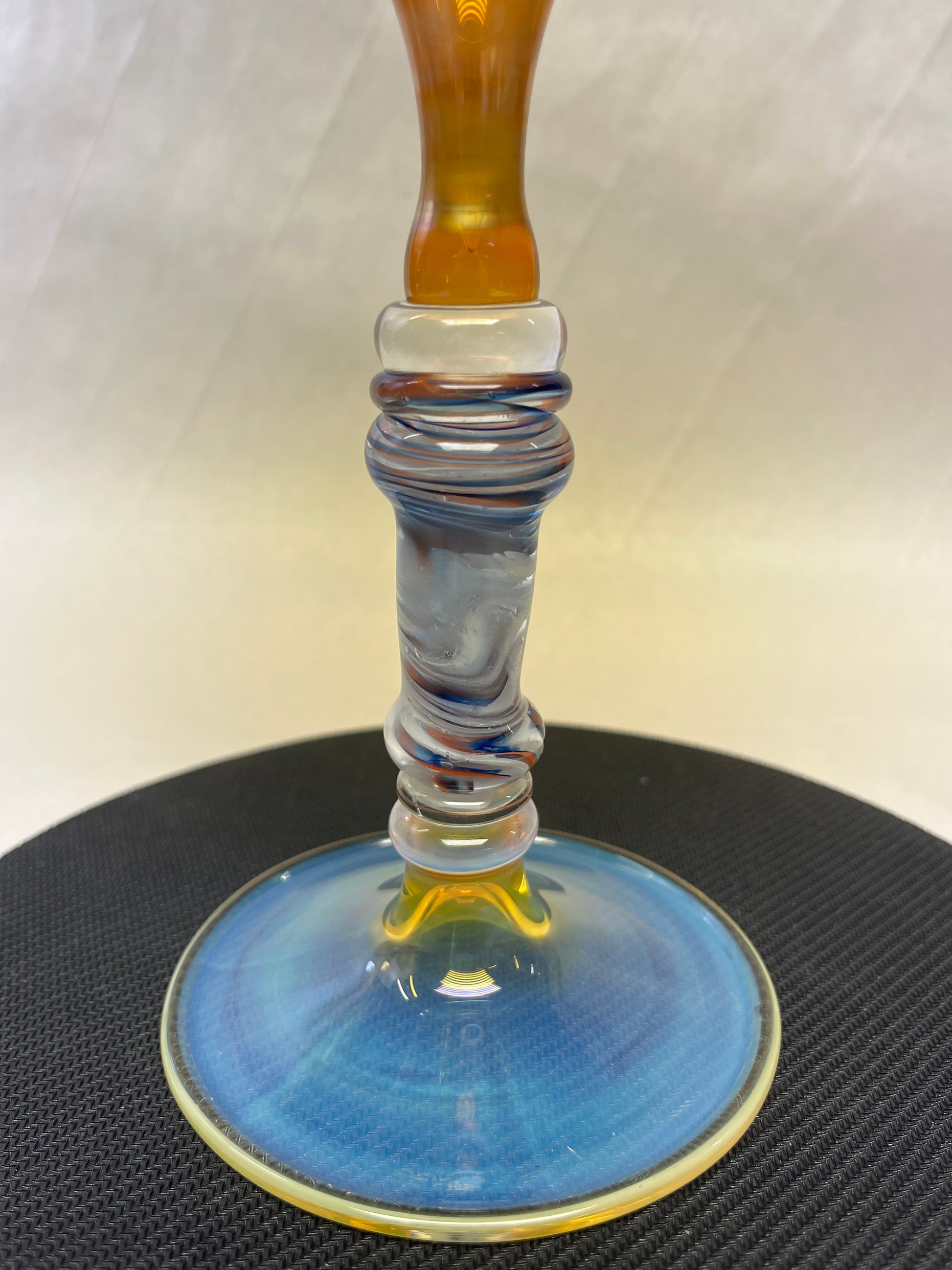Elevate your experience with this handcrafted glass chalice, part of the exclusive Aurora Stem Series by Throckmorton. Featuring a luminous golden bowl with subtle opalescence, this piece captures and reflects light with mesmerizing depth. The stem, a sculptural interplay of twisted blues, purples, and amber tones, anchors the piece in rich color and form. Resting on a wide, soft-gradient blue foot, the chalice is both balanced and bold—a true statement of functional art.