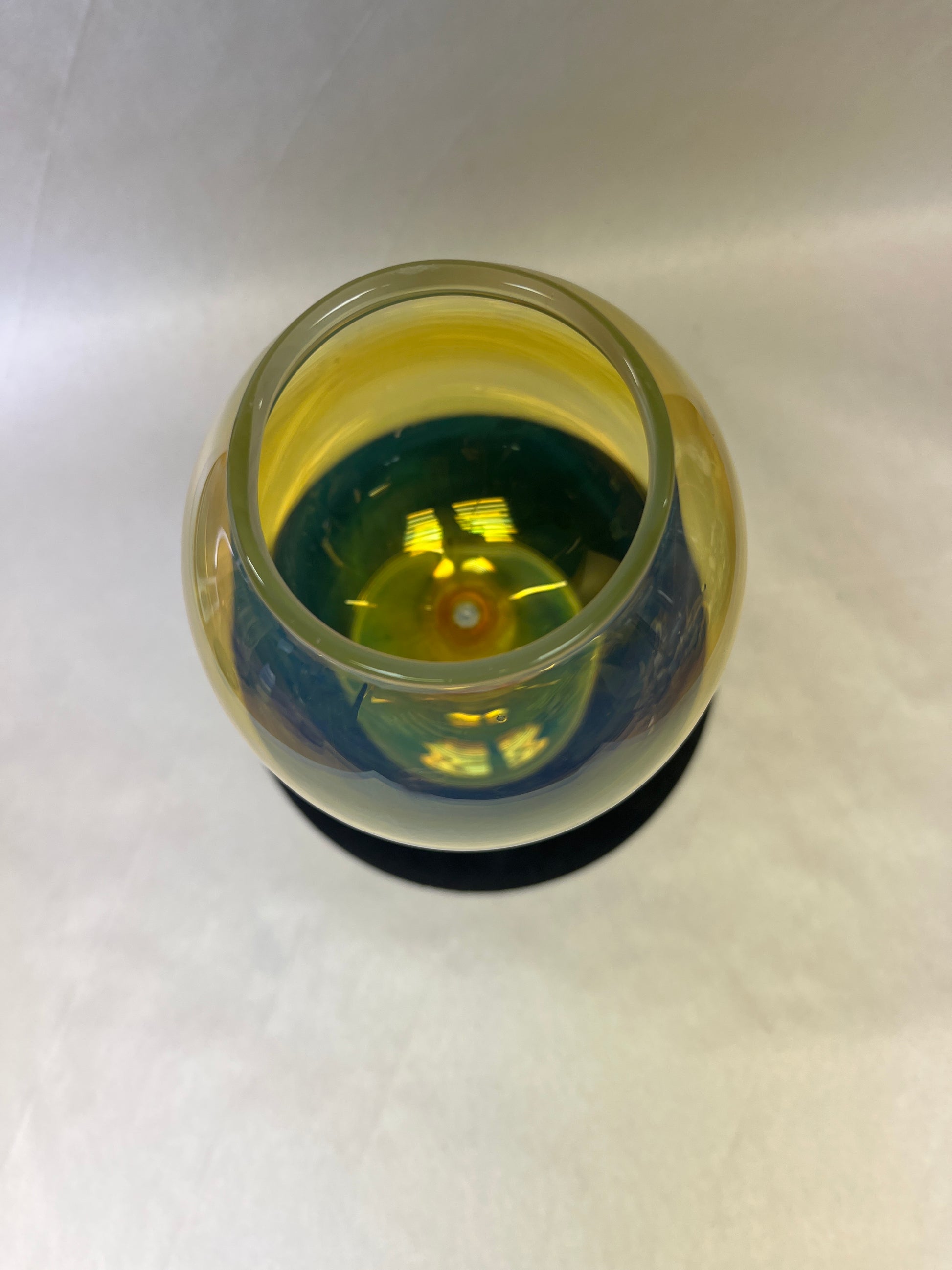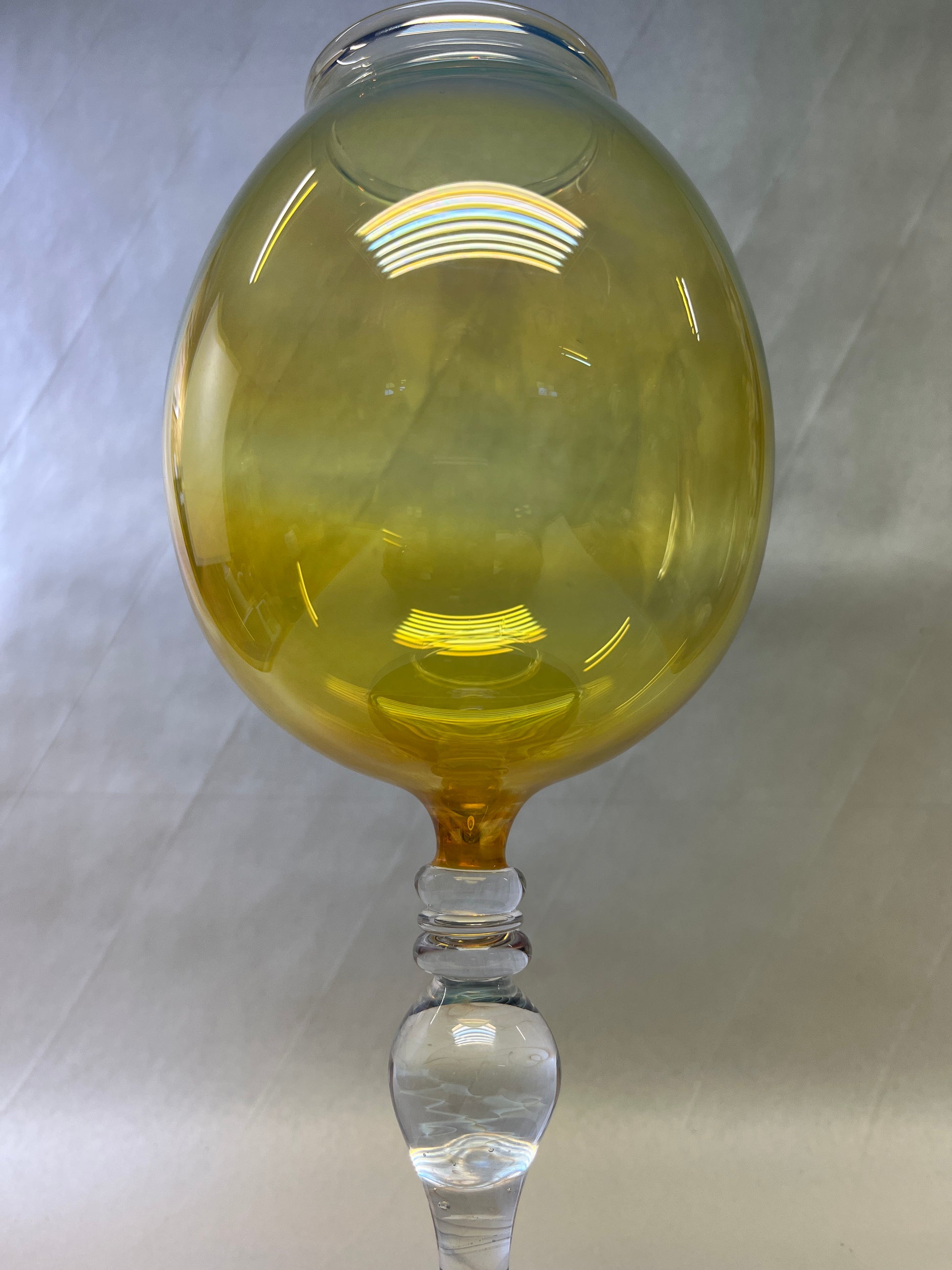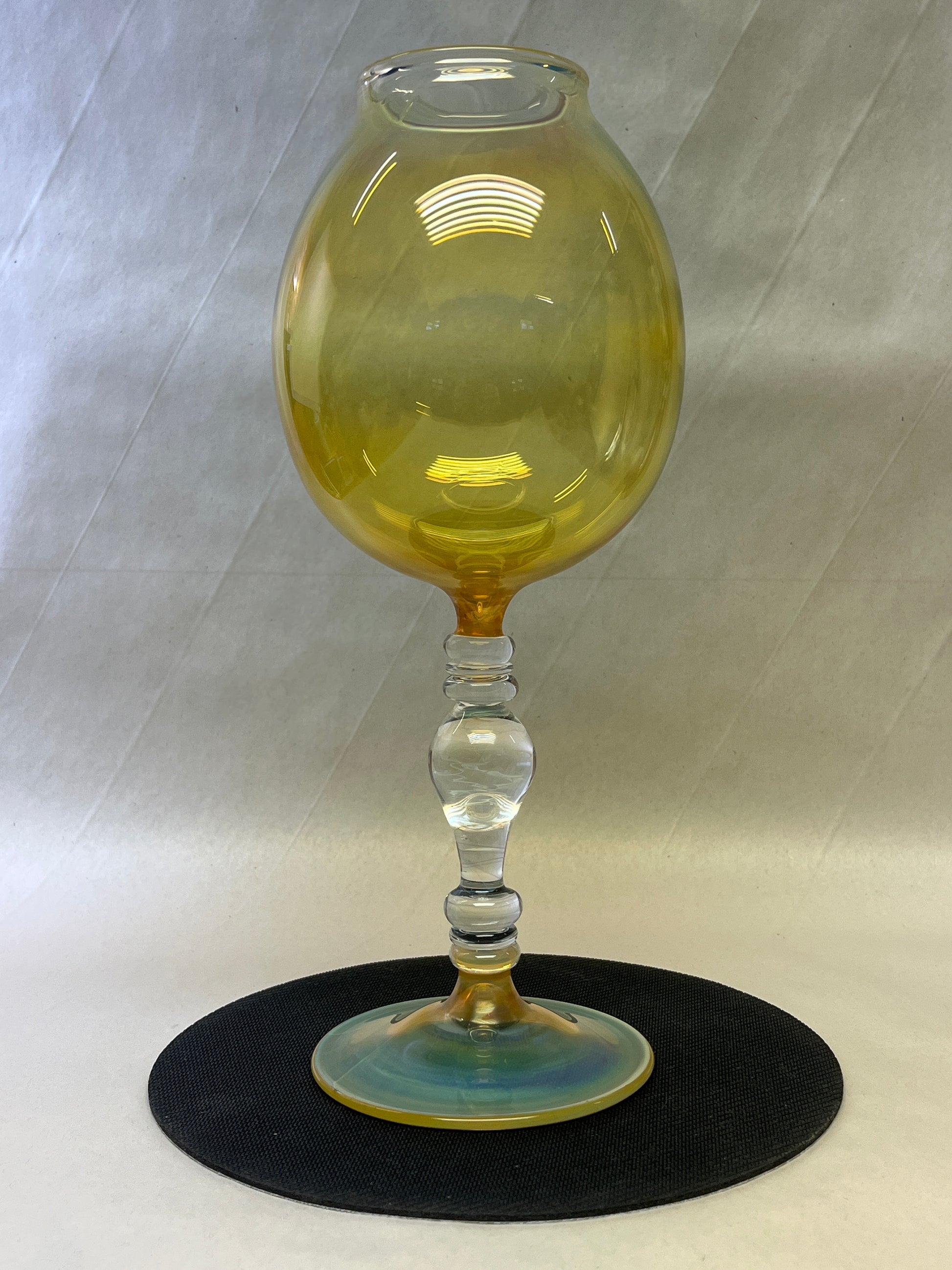 Elevate your glassware collection with this exquisite hand-blown goblet, crafted by Throckmorton – Maker of Fire & Smoke. Featuring a generous bowl perfect for wine or display, this goblet showcases a sculpted stem with intricate clear detailing and a subtle infusion of bubbles and gold-hued swirls suspended in the glass. The sturdy base, tinted in a rich smoky blue, provides balance and contrast to the crystal-clear top. A stunning fusion of function and art, this piece exemplifies the fire-forged elegance Throckmorton is known for.