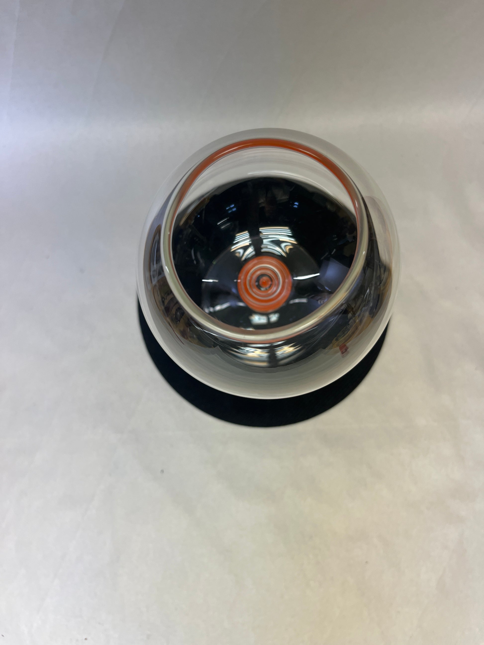Elevate your table with timeless craftsmanship. This handblown goblet features a generous bowl perched atop a striking stem of fiery orange swirls, delicately encased in crystal-clear glass. The intricate shaping and balanced form make it as much a piece of art as a functional vessel. Ideal for wine, cocktails, or as a statement piece in any collection.