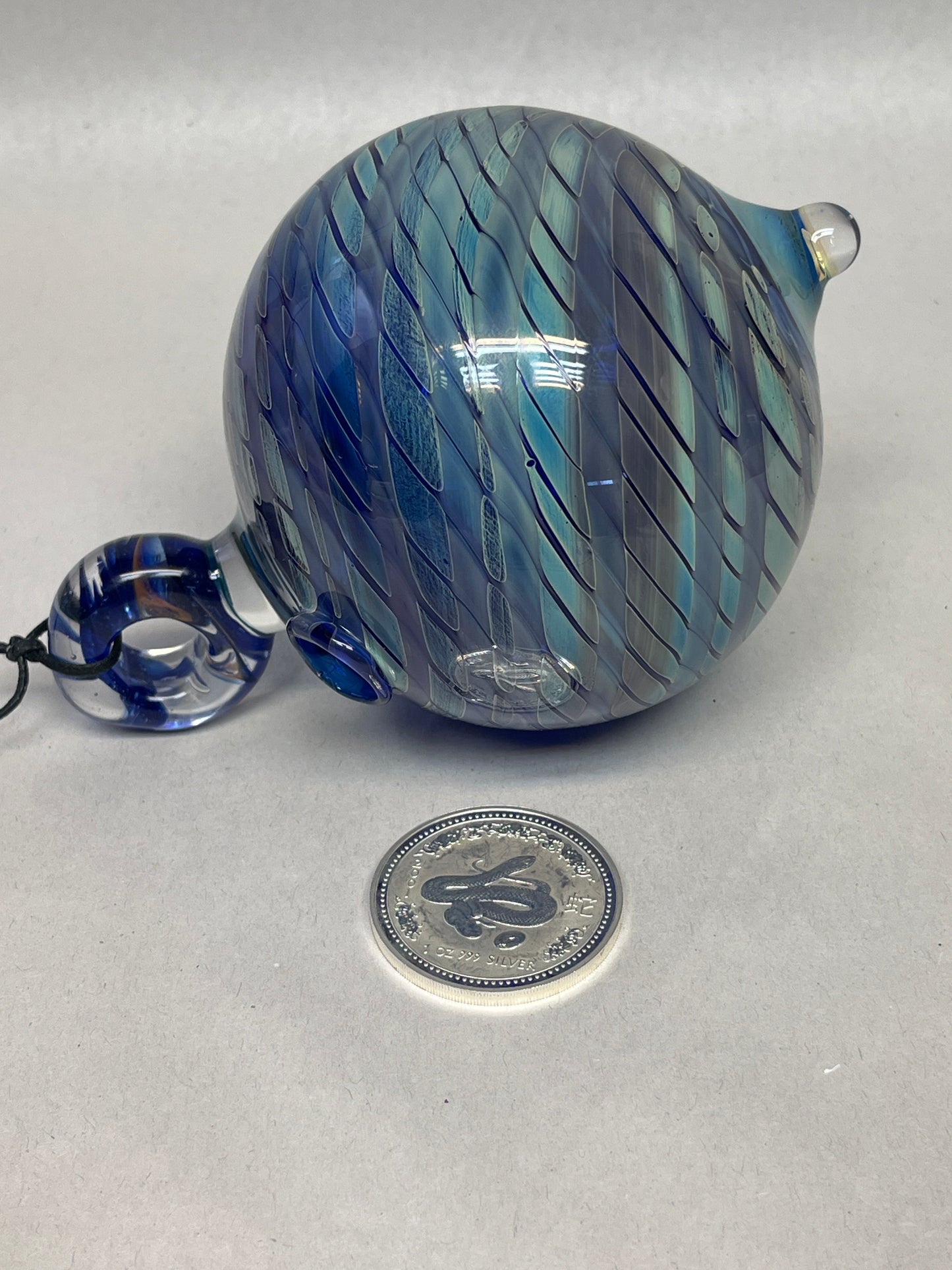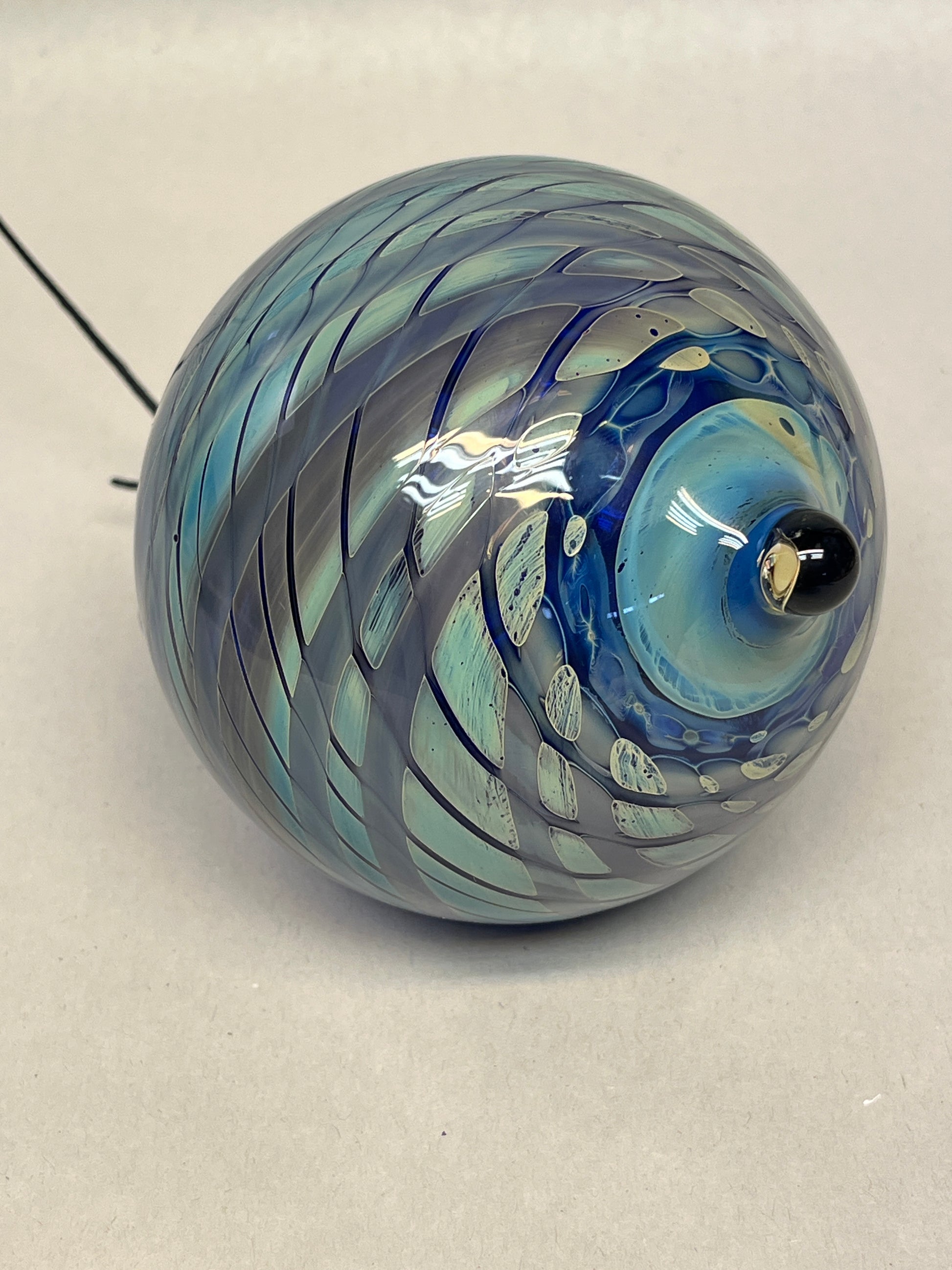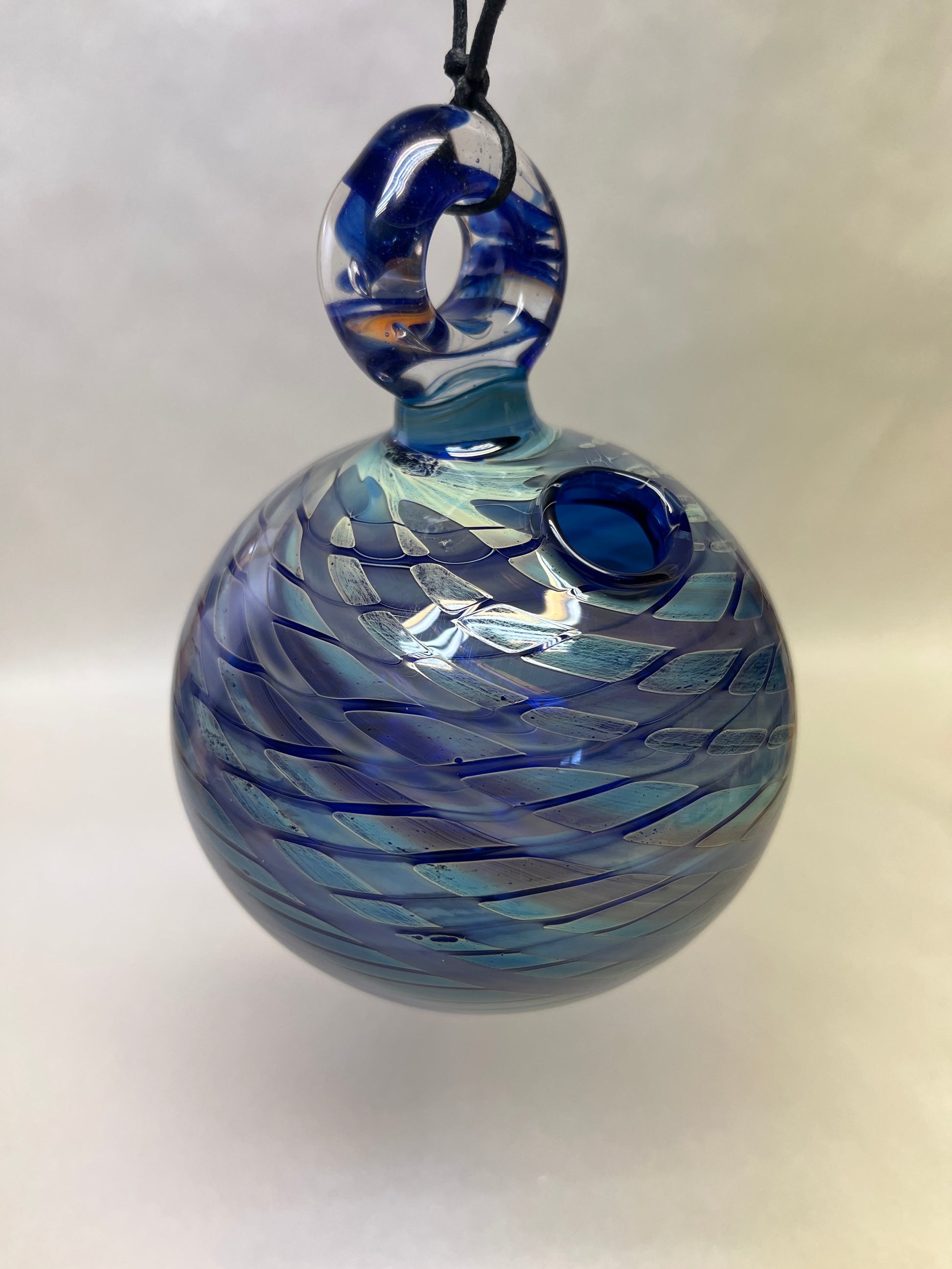 Each Rooter Ball is a one-of-a-kind, hand-blown glass vessel designed for propagating plants with style and elegance. Crafted by Jeremiah Throckmorton, no two pieces are ever the same — every swirl of deep blue and shimmering highlight is uniquely shaped by fire and hand. Simply fill the Rooter Ball with water, insert your plant cutting, and watch roots flourish in a floating display of living art. Featuring a sturdy hanging loop and durable construction, the Rooter Ball turns the beauty of growth into an everyday experience.